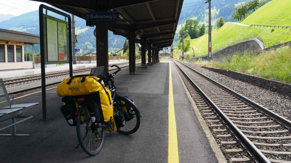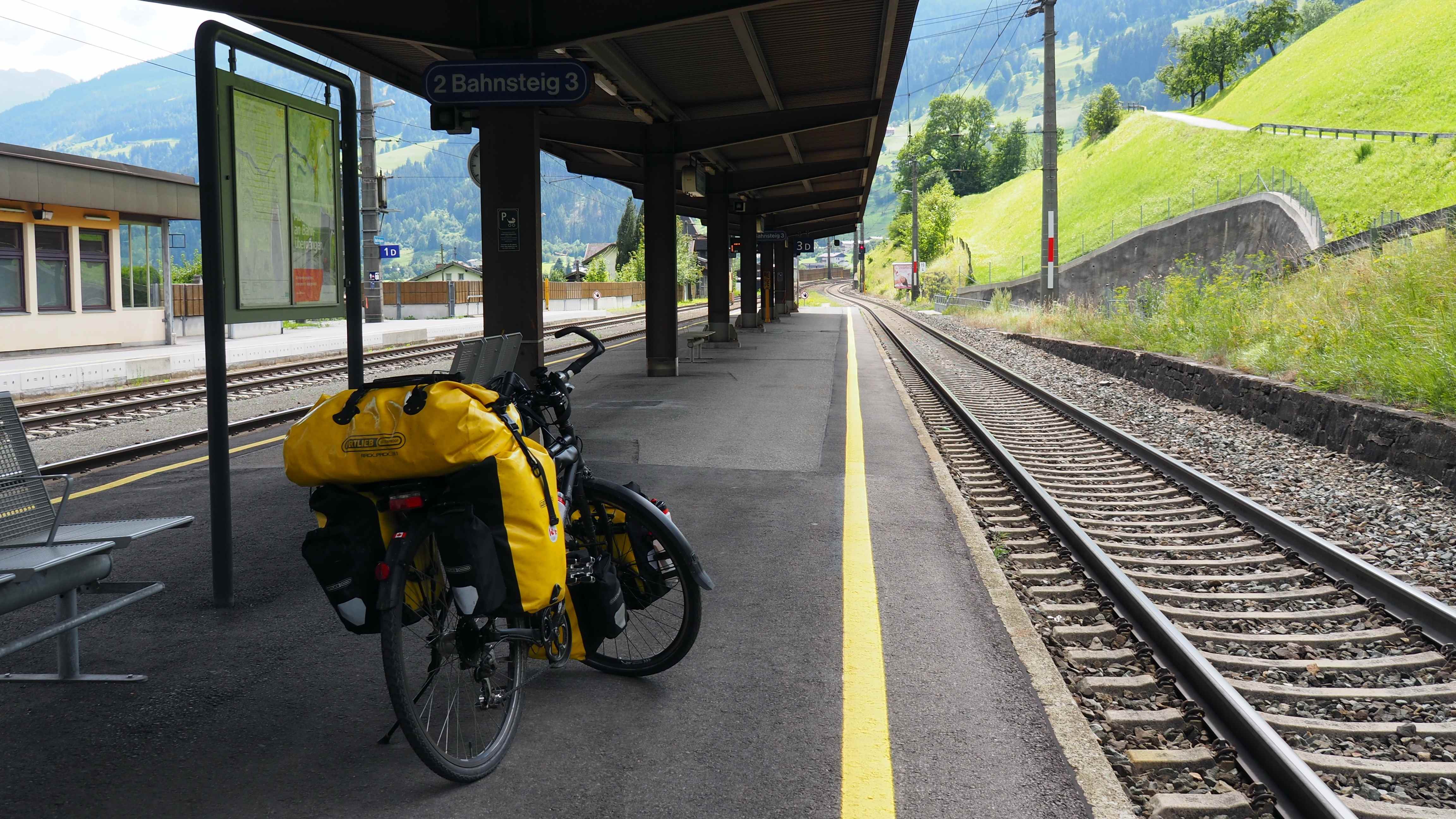 Ich war dann überpünktlich am Bahnhof in Bad Hofgastein, schaffte es mit meinem Tablet ein Ticket zu kaufen und eine Fahrradplatzreservierung zu bekommen. Aber ich musste auch auf den anderen Bahnsteig und – es gab keinen Aufzug. Also alles runter vom Rad, Rad in den Tunnel, Taschen in den Tunnel, dann die ganze Aktion auf der anderen Seite wieder treppauf. Taschen wieder aufladen, denn ich wusste ja nur ungefähr laut Wagenreihungsanzeiger wo mein Wagen vermutlich hält. Orientierungsbuchstaben am Bahnsteig wie in Deutschland gab es nicht. Der Zug kam pünktlich, „ah – da ist mein Wagen!“ – ich riss die Tür auf, nahm die Taschen wieder vom Rad, schob das Rad irgendwie provisorisch hinein und alle Taschen in Windeseile hinterher, schon fuhr der Zug an! Mist, der einzige Haken für ein Fahrrad war bereits besetzt! Ist denn das nicht meiner?