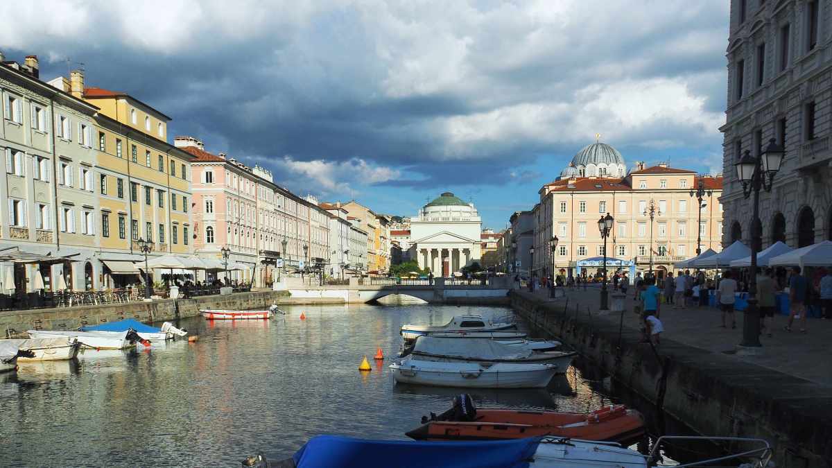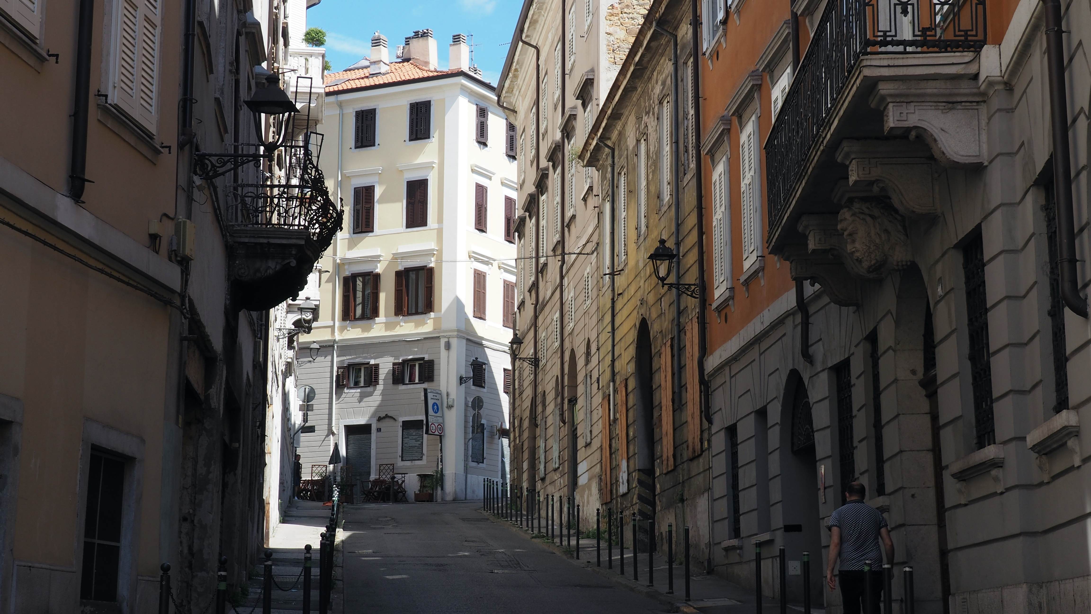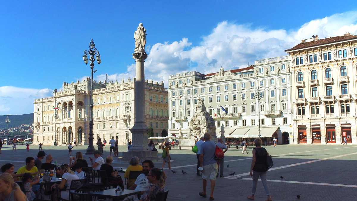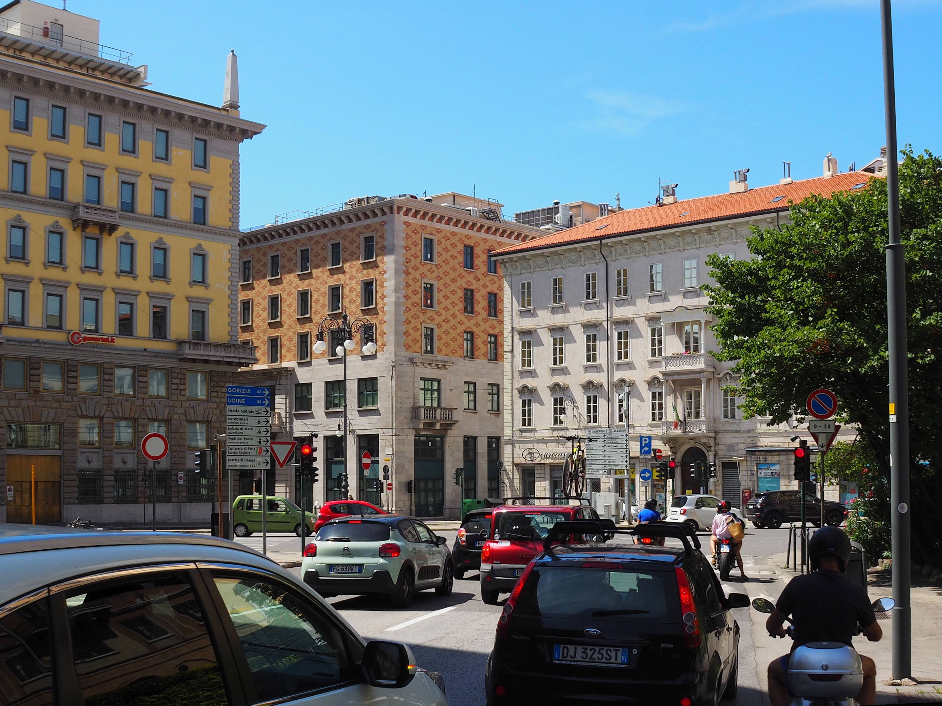 Das gesamte Gebiet gehörte bis zum Ende des Ersten Weltkrieges zu Österreich-Ungarn, bis dann 1918 das italienische Kriegsschiff „Audace“ kam und Triest eroberte. Auch Slowenien als Nation innerhalb Jugoslawiens entstand zu dieser Zeit. Es ist erst seit 1991 unabhängig und konnte sich nach nur 12 Tagen aus dem Jugoslawien-Krieg heraushalten. Je näher ich der Grenze kam, desto stärker ging es bergab, von 670 m auf 0 m. Eine lange, schnelle Abfahrt und plötzlich befand ich mich am Pier von Triest. Ich schob das Rad durch eine enge Gasse zu meinem 35 € Hotel in der „Via Felice Venetian“, der „Straße des glücklichen Venezianers“, stellte meine Sachen in einem muffigen Zimmer ab und machte einen Stadtspaziergang. Hier ist das Ergebnis des Tages. (Italienisch gehört übrigens zu jenen Sprachen von denen, die ich nie gelernt habe, die ich immer noch am besten verstehe. Und manchmal schaffe ich es, etwas auf Italienisch zu bestellen, ohne eine Antwort auf Englisch zu bekommen…)