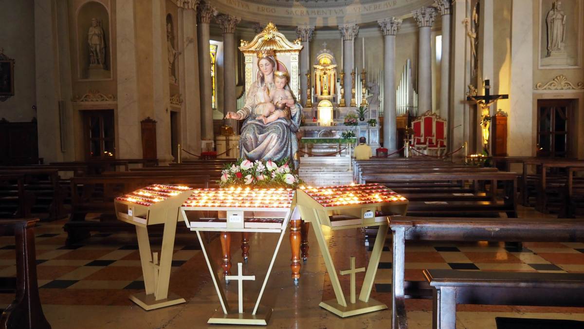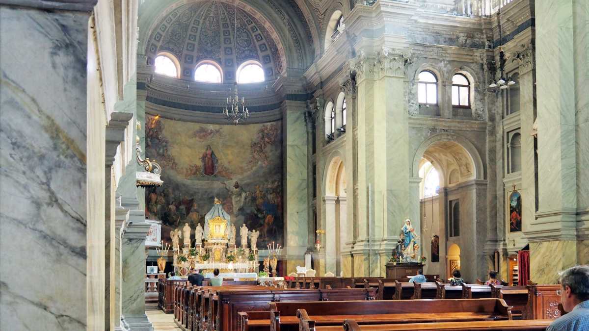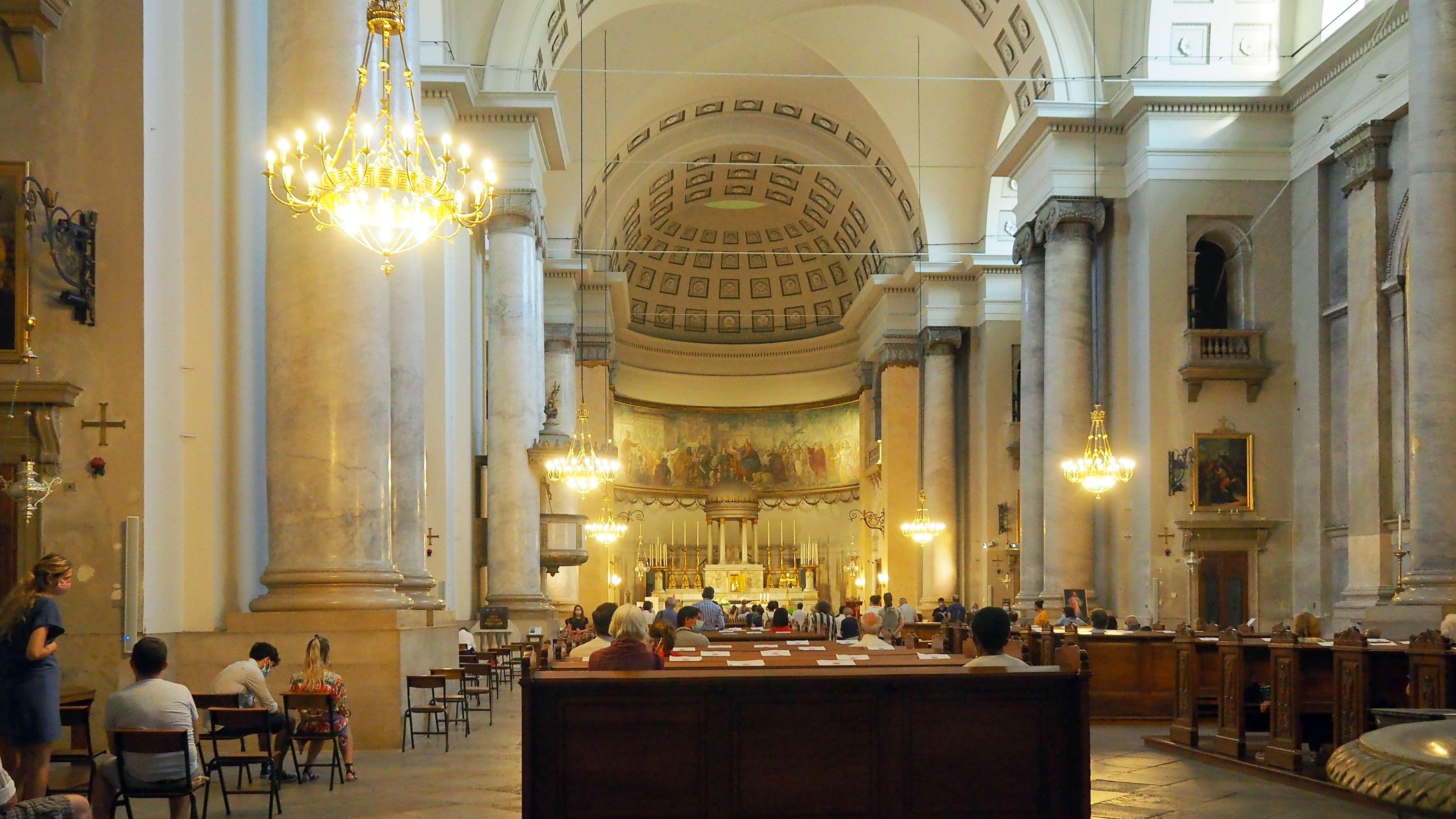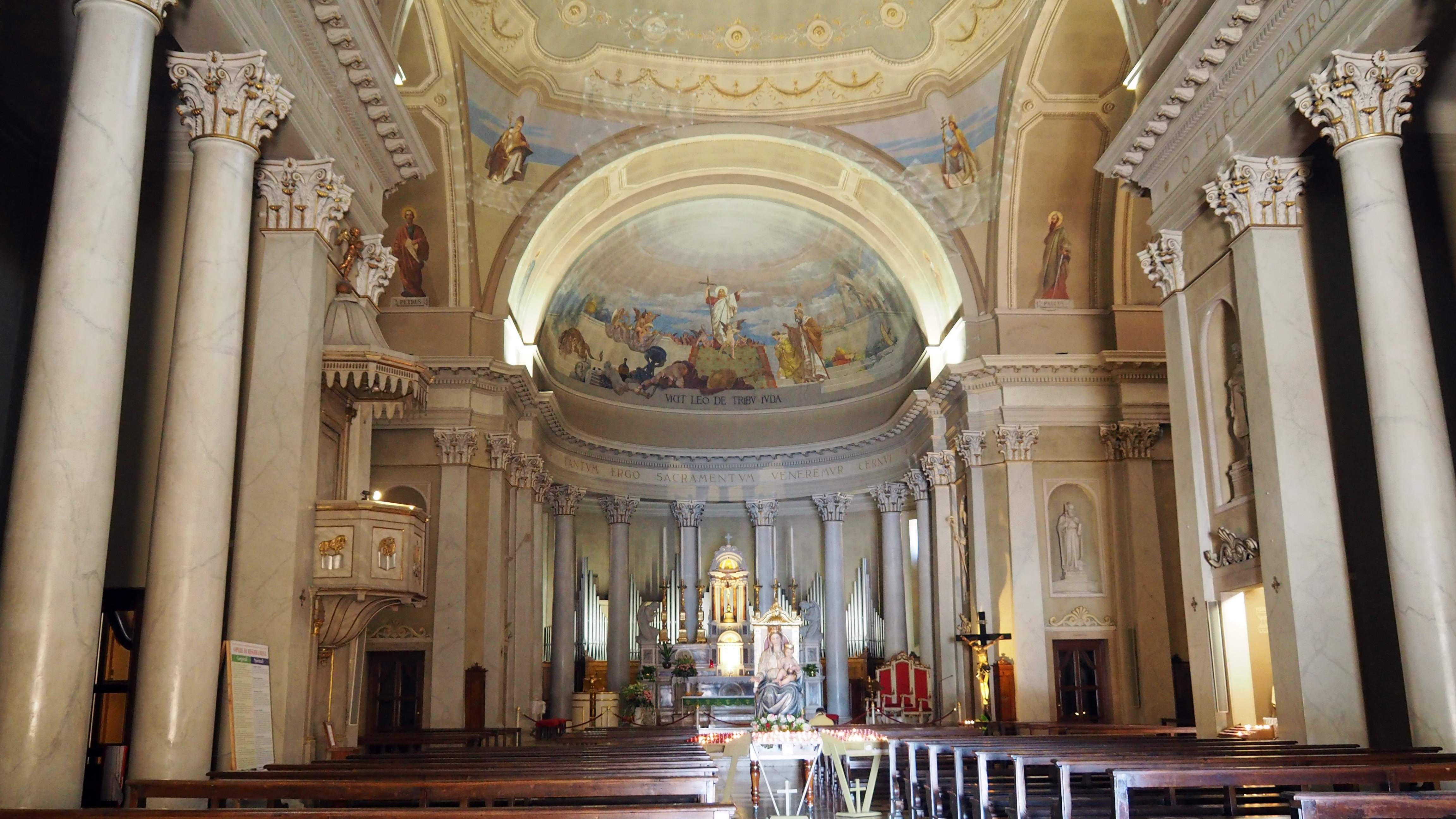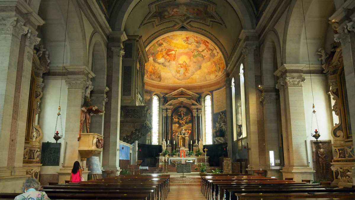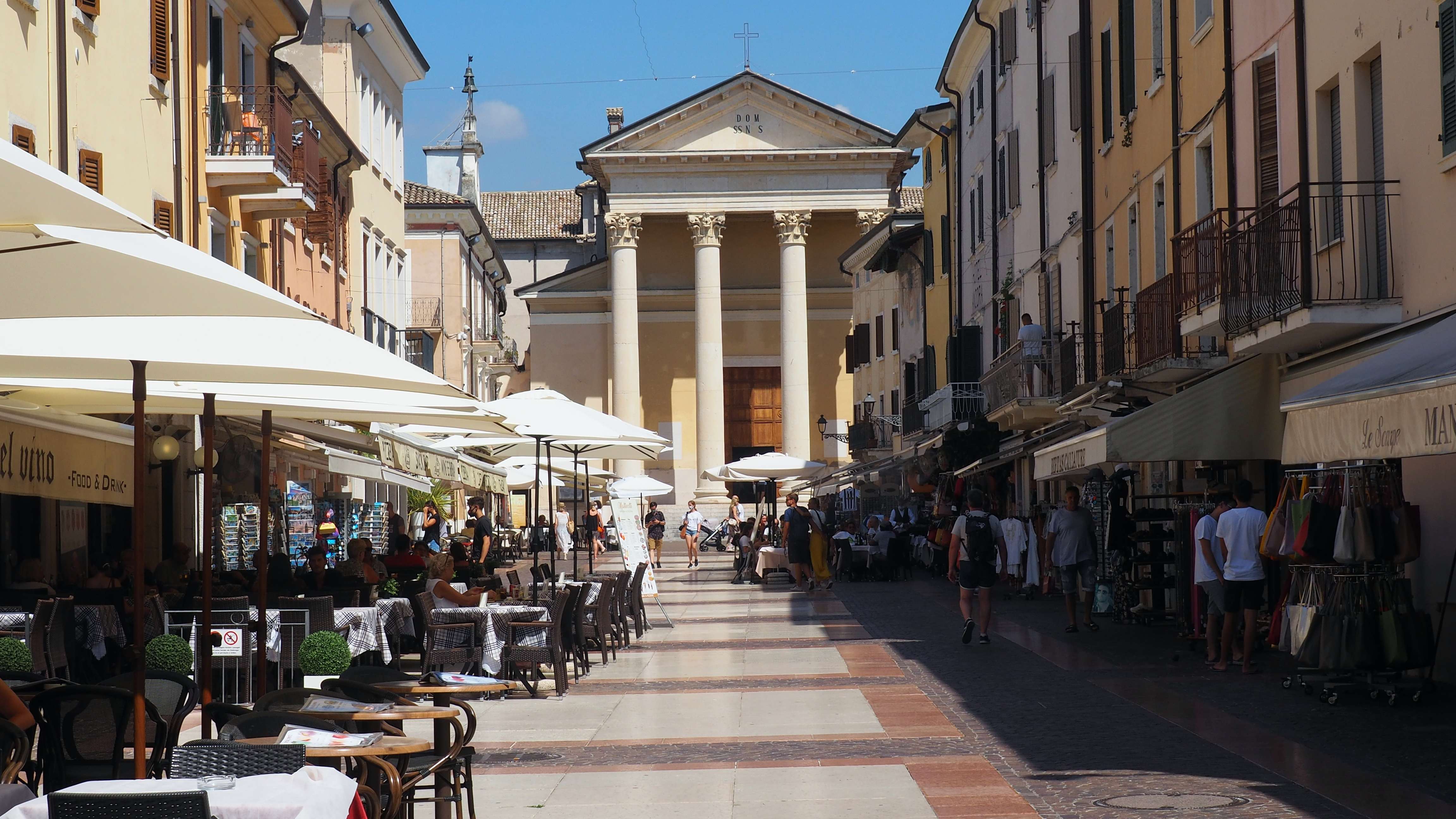 Bardolino: Ich schiebe das Rad wie durch ein riesiges Restaurant, und am Ende steht der Tempel des Lucullus? Nein, es ist die „Chiesa parrocchiale dei Santi Nicolò e Severo“, die wie ein antiker Tempel die Sichtachse beherrscht.