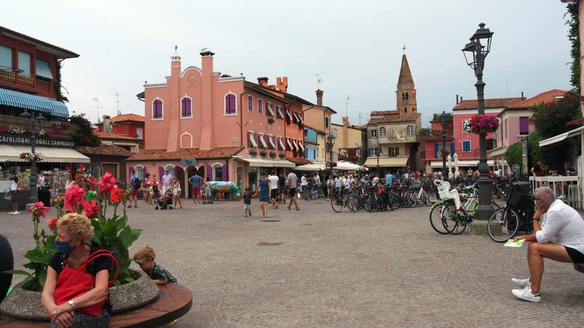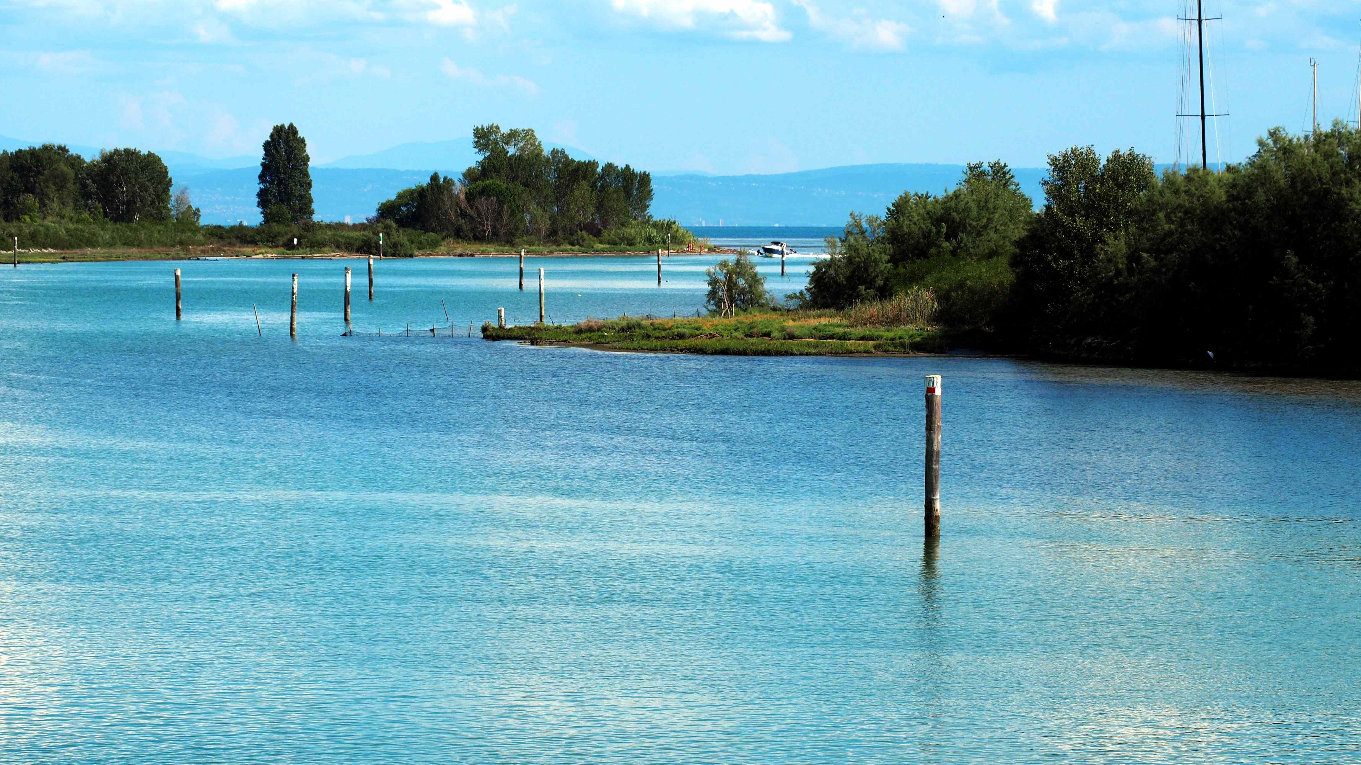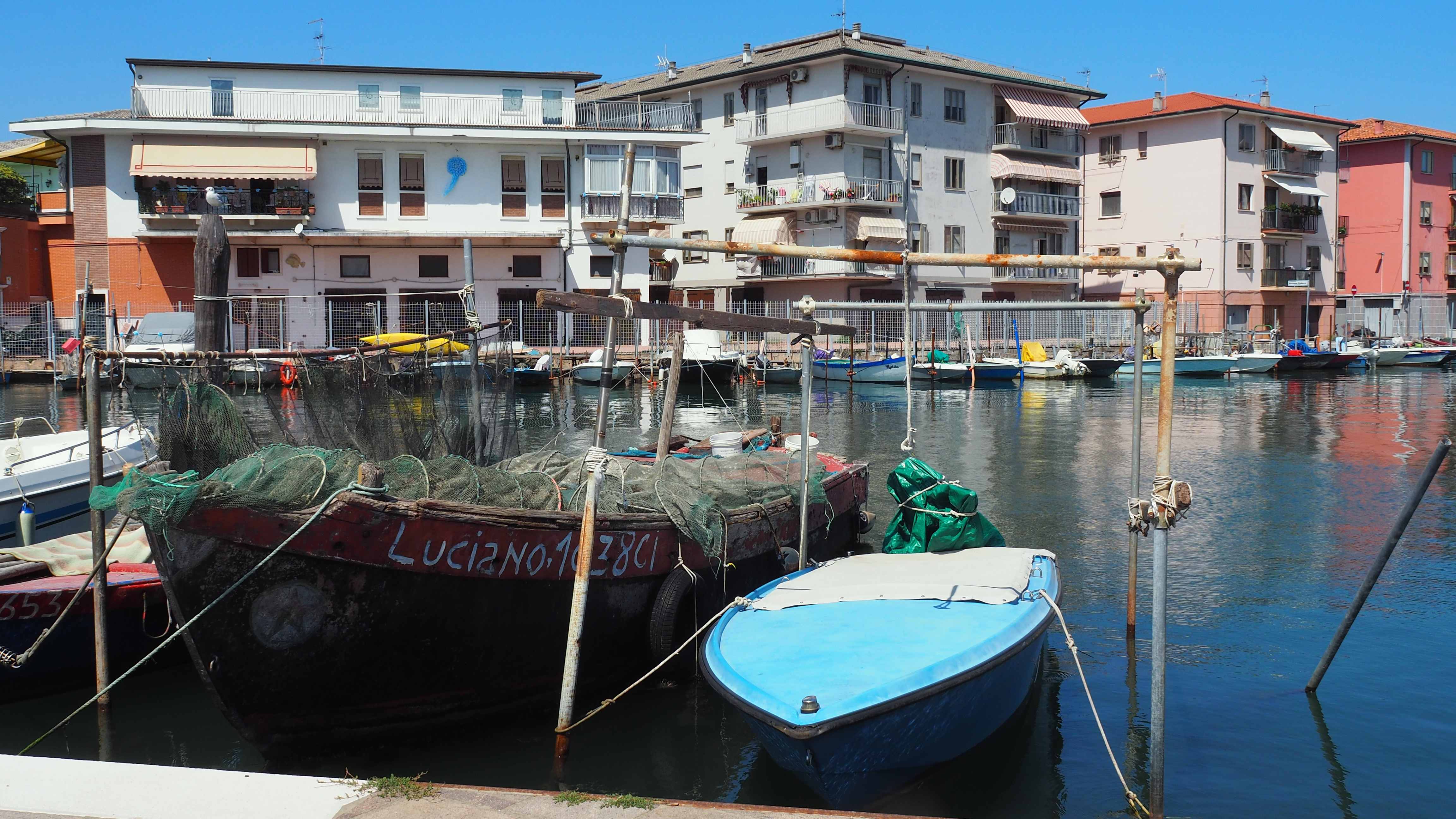Hinter Montefalcone fuhr ich dann nach einem Mittagessen (mit langer Wartezeit auf einen Teller Nudeln) über einsame Nebenstraßen durch eine Landschaft von Kanälen und Lagunen. Das ist das „Riserva Naturale Regionale della Foce dell’Isonzo Isola della Cona“. Es gibt Fahrradrouten bis nach Grado, einem touristischen Hotspot. Hier konnte ich endlich ins Meer springen oder besser waten. Leider war es kein besonderes Vergnügen an einem überfüllten Strand mit badewannenwarmem Wasser schwimmen zu gehen. Deshalb fuhr ich weiter bis nach Aquileia und werde morgen früh römische Geschichte studieren!