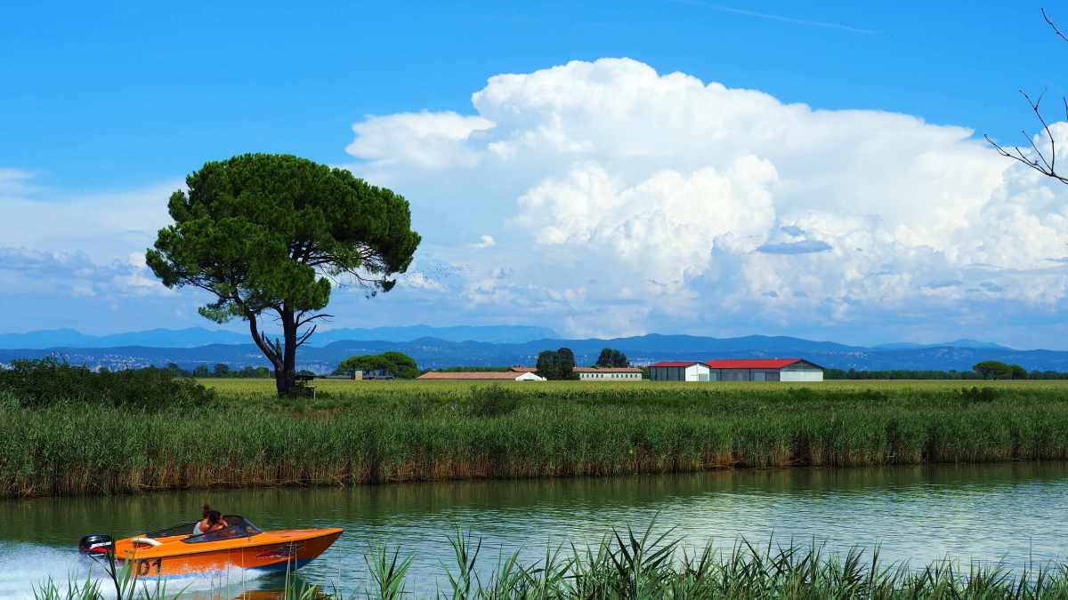 Von Aquileila aus fuhr ich in der Hitze durch eine ziemlich langweilige Agrarlandschaft. Am Nachmittag dann wieder in ein Gewitter. Ich nahm es mit Gelassenheit und suchte Schutz unter dem Vordach eines stillgelegten Restaurants. Bald kamen zwei weitere Radsportler. Sie grüßten kurz, sprachen aber sonst kein Wort mit mir. Ich war wohl nicht ihre Liga.