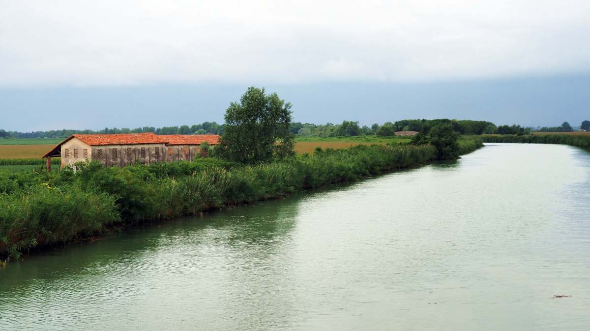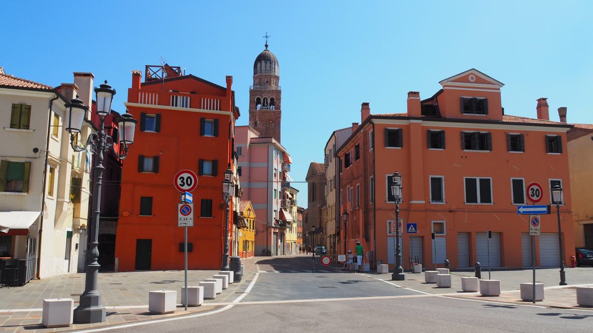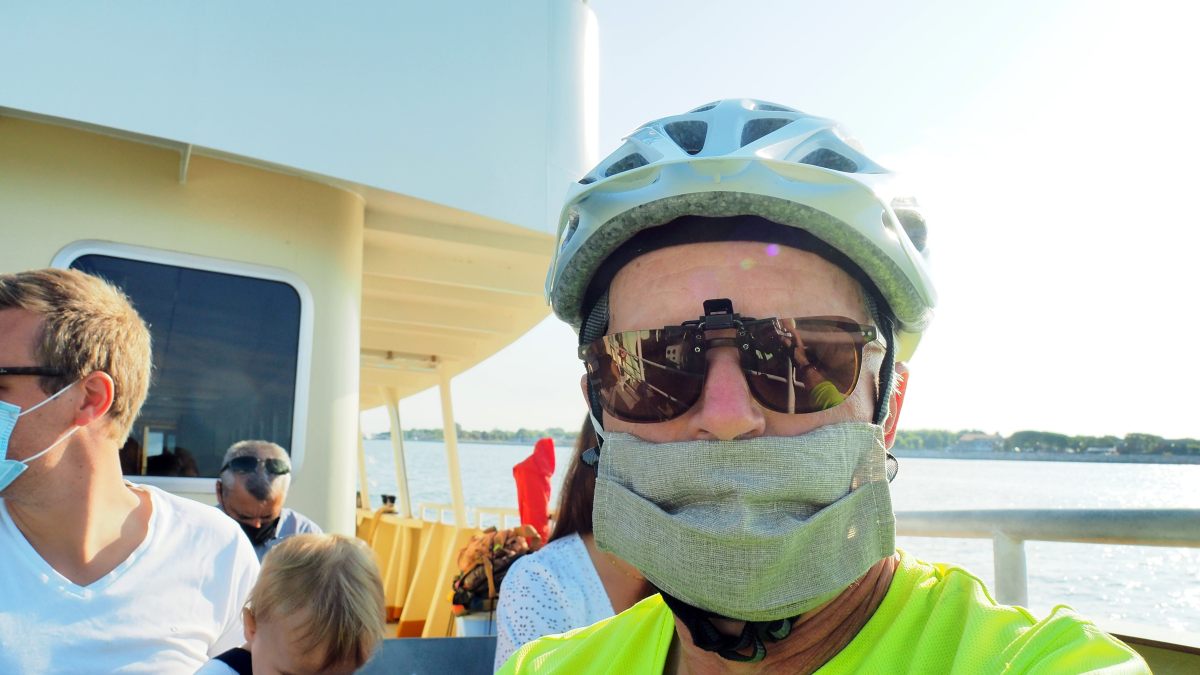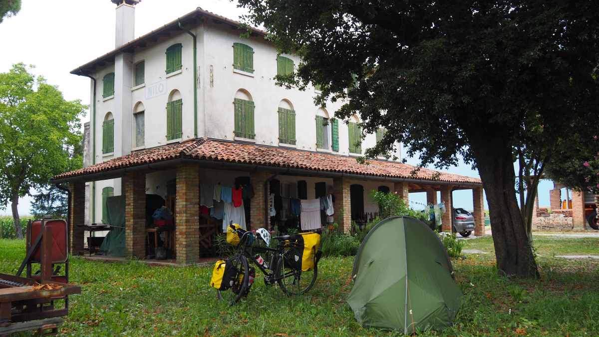 Nach einer kurzen Überfahrt kamen wir in Chioggia an, einer malerischen Hafenstadt, deren Schönheit sich nicht sehr gut fotografieren ließ, weil die lange Hauptstraße komplett mit Marktständen blockiert war … Ein Wachmann achtete auf perfekt sitzenden Mundschutz. Ich floh schnell in eine Seitengasse und dort in ein Restaurant zum Mittagessen. Dann versuchte ich, meine Route zu finden, was sich als nicht so einfach herausstellte. Trotz Navi, das mich über eine 5 km lange Brücke auf eine 4-spurige autobahnartiger Straße zwingen wollte, verirrte ich mich noch in einem Durcheinander von Kreisverkehren. Schließlich landete ich auf einem schmalen Pfad, der etwa 20 km entlang eines Kanals führte. Schnurgerade, ohne Brücke zum anderen Ufer durchschneidet diese ökologische Sünde metertief die Landschaft. Weiter nach Westen auf einer Regionalstraße und bei Rückenwind war es dann auch leicht, 23 bis 25 km / h schnell zu fahren. Es machte mir daher nichts aus, dass die Strecke eigentlich ziemlich langweilig war. Es war wieder heiß mit über 30 ° C. Ich machte Pause in einem Dorfcafé und buchte mir schnell ein Zimmer in passender Entfernung. Wieder mal endete meine ursprüngliche Idee, irgendwo wild zu campen, damit, dass ich nach 77 km in einem klimatisierten B & B-Raum saß … Morgen und übermorgen wird es noch heißer!