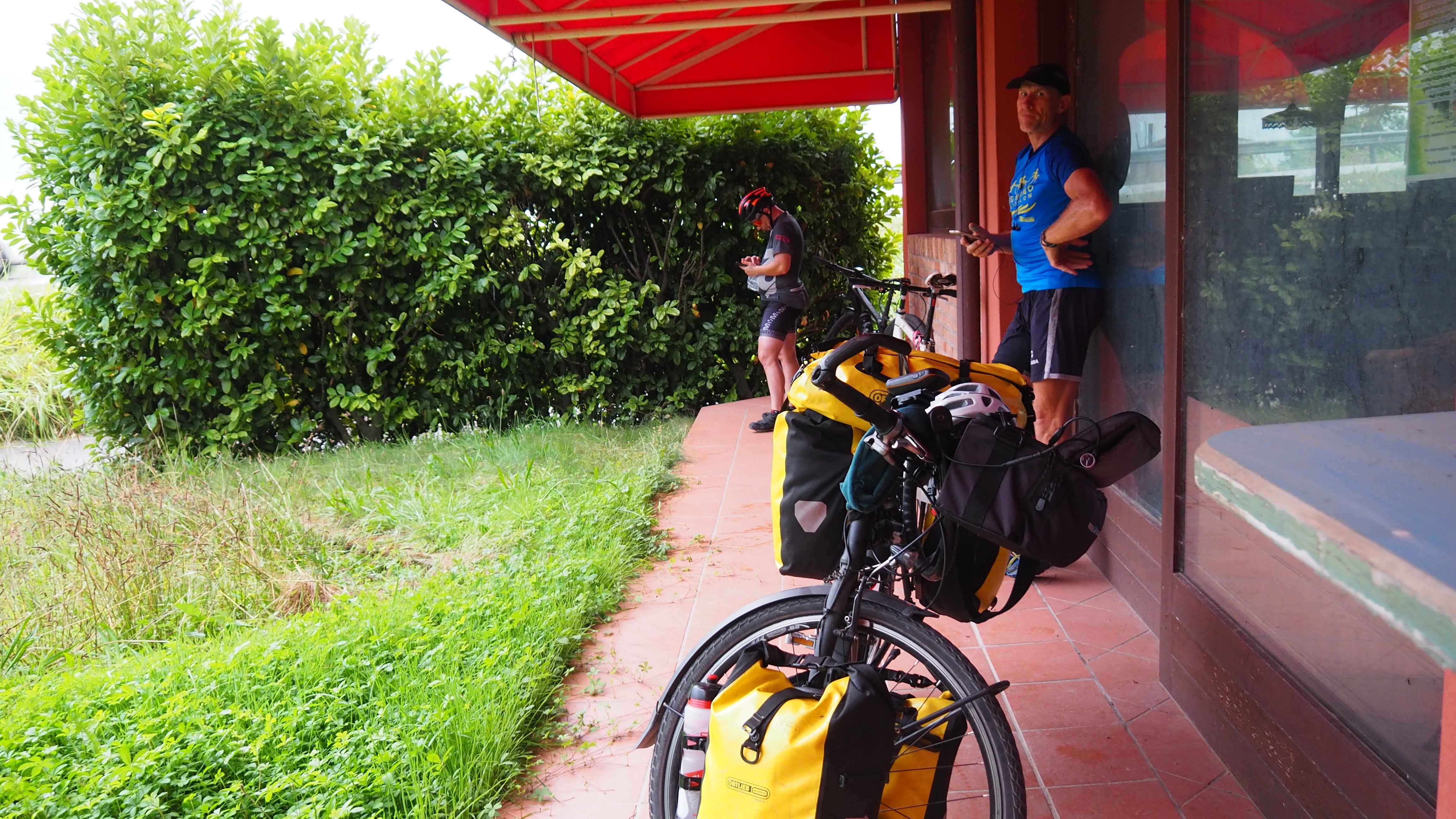 Glückliche Zuflucht bei Regen. Bushaltestellen sind meist überdacht und manche haben sogar einen Fahrradständer!