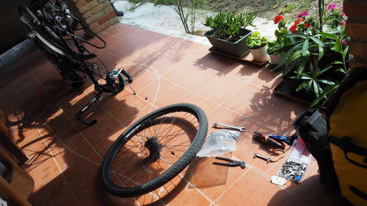 Heute Morgen dachte ich, es wäre eine gute Idee, den Vorderradschlauch zu reparieren. Noch war es nicht dramatisch, aber mittlerweile musste ich zweimal am Tag Luft nachpumpen. Die Gelegenheit schien günstig, die Landarbeiter waren zur Arbeit gegangen und ich hatte einen guten Platz auf der Veranda, um das Problem zu lösen.