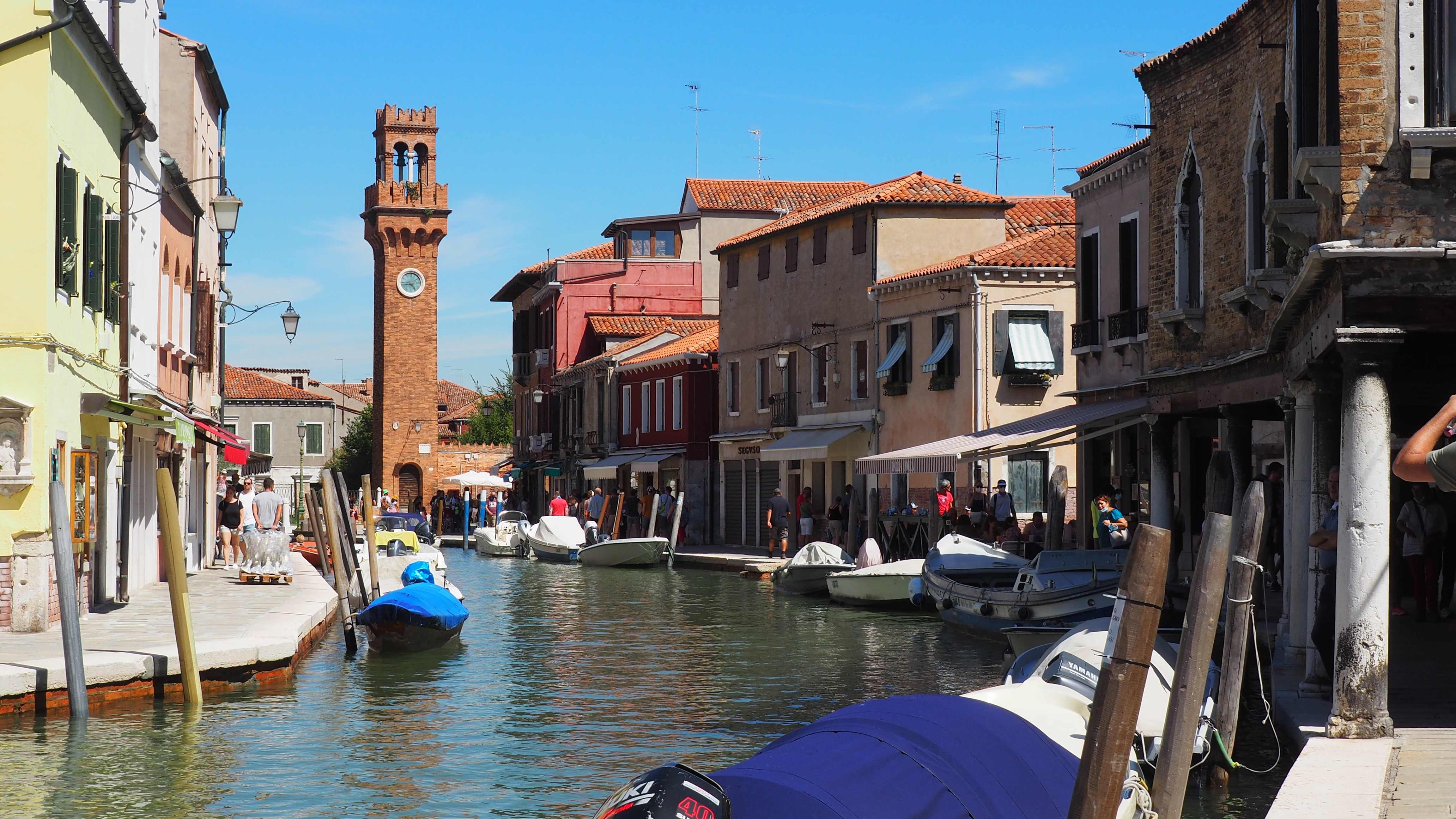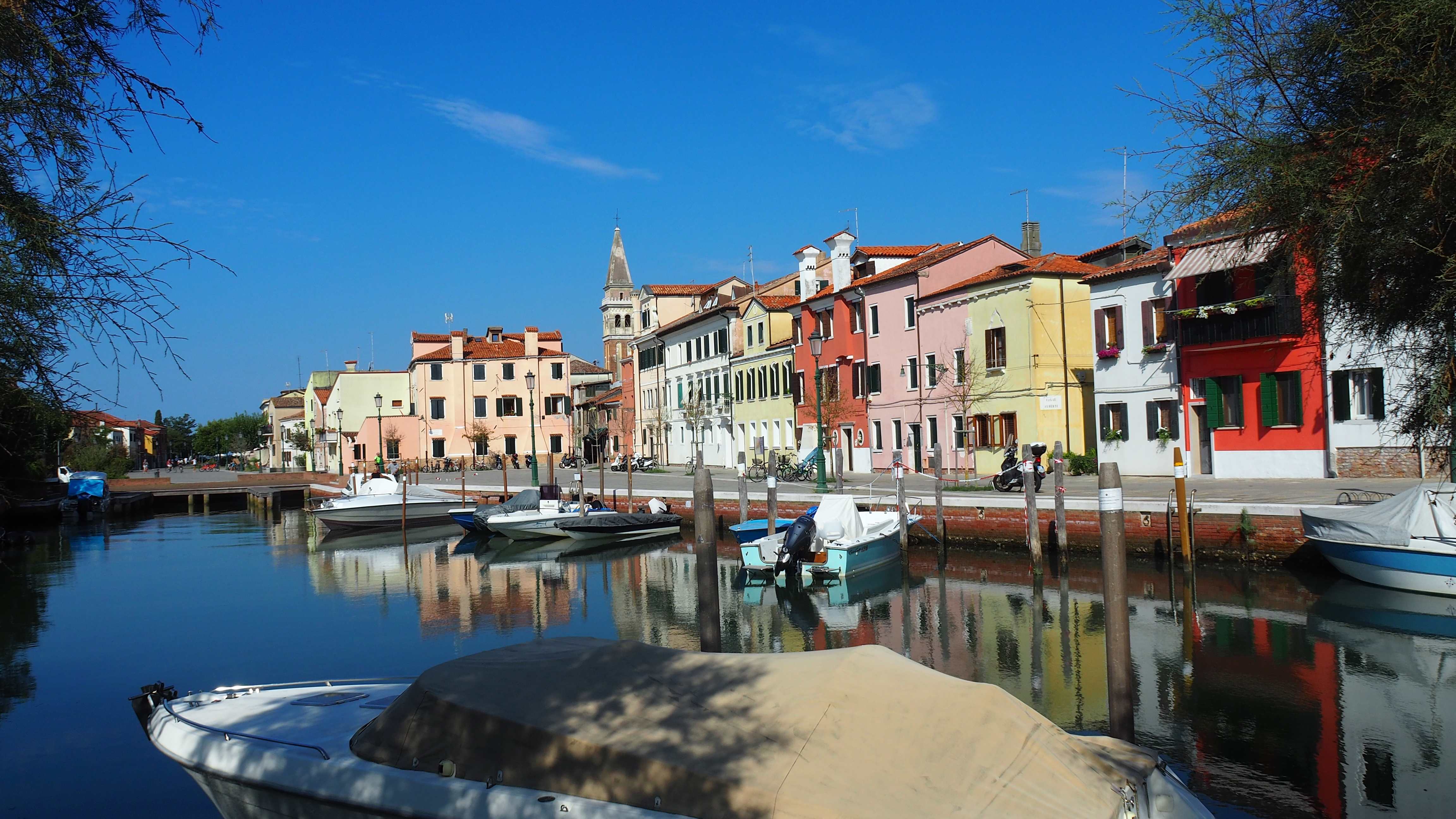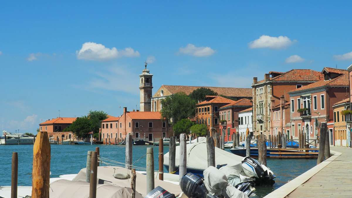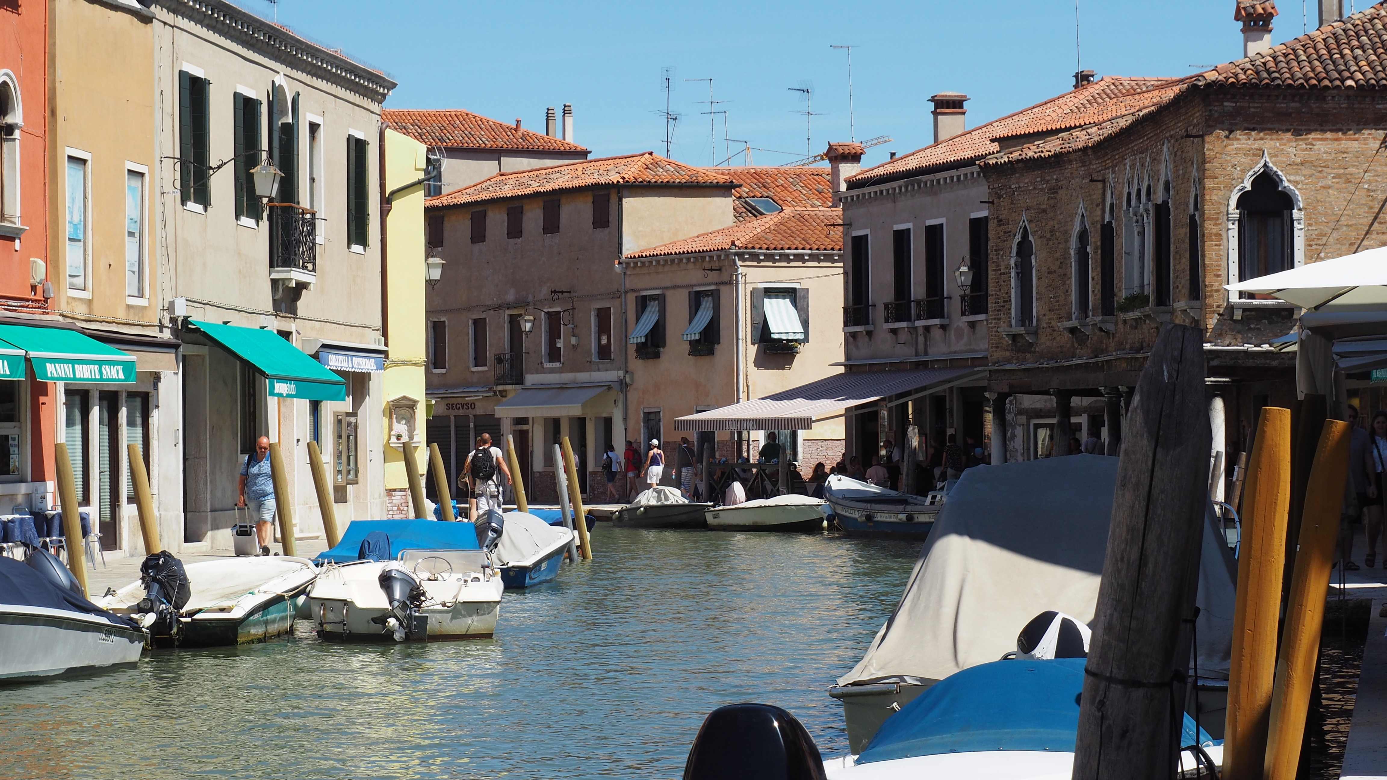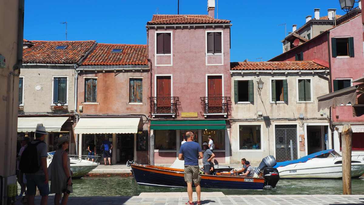 Tag 17: Heute Morgen bin ich zur Anlegestelle der Vaporetti in Treporti gefahren. Ich fand dort glücklicherweise einen offiziellen Fahrradparkplatz und schloss mein Fahrrad dort an. Die Vaporetti-Boote des Venezianischen Nahverkehrs befahren die Strecke Burano – Murano – Venedig. Ich hatte mich noch nicht entschieden, was ich alles sehen wollte, aber Burano und Murano waren die ersten Stationen, an denen ich aussteigen konnte. Bei wieder heißem Wetter fluteten die bisher in Venedig wegen Corona vermissten Touristen auf die Schiffe. Alle benahmen sich vorbildlich und trugen ihre Maske, manche sogar draußen auf den Straßen im Freien.