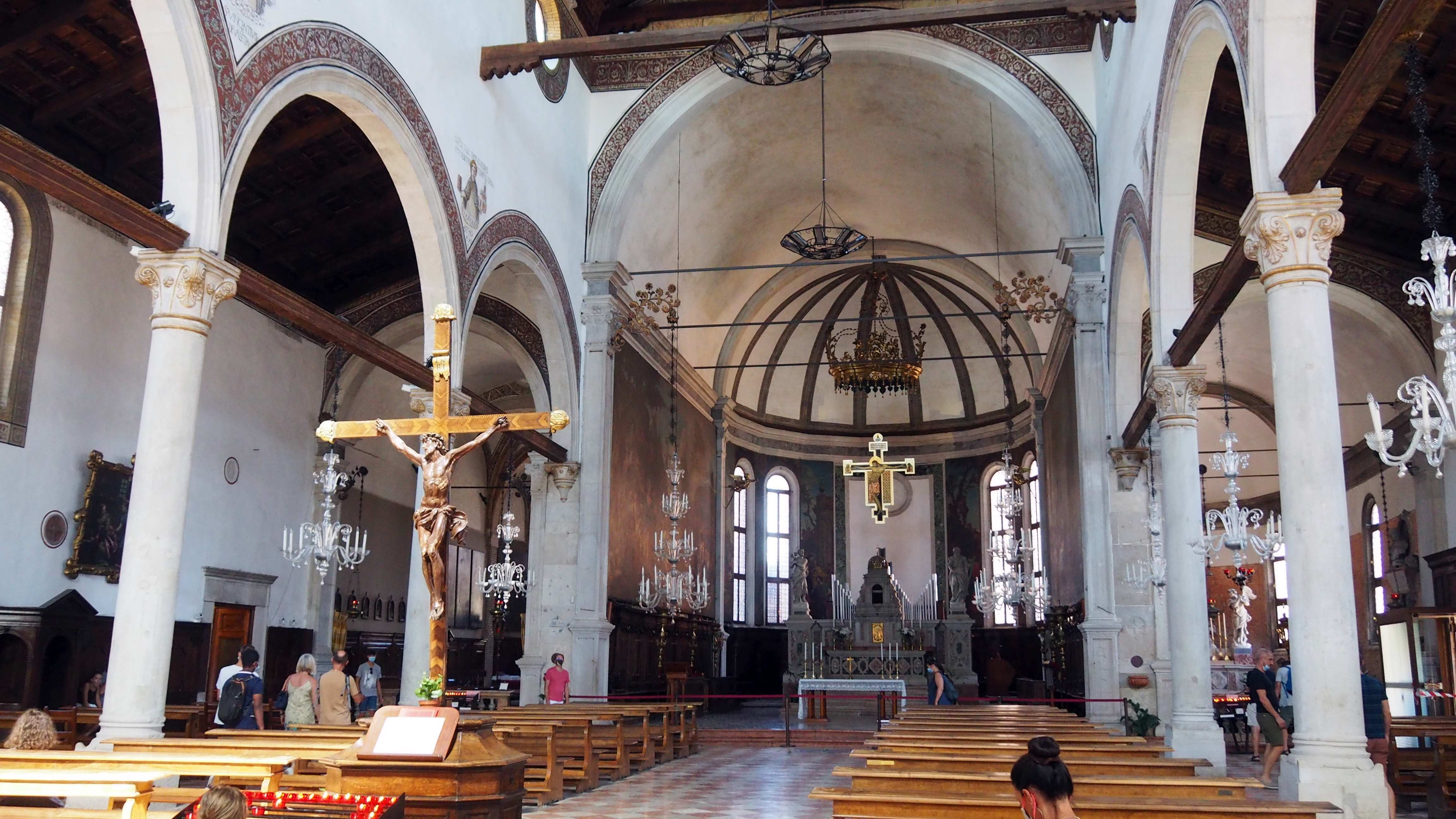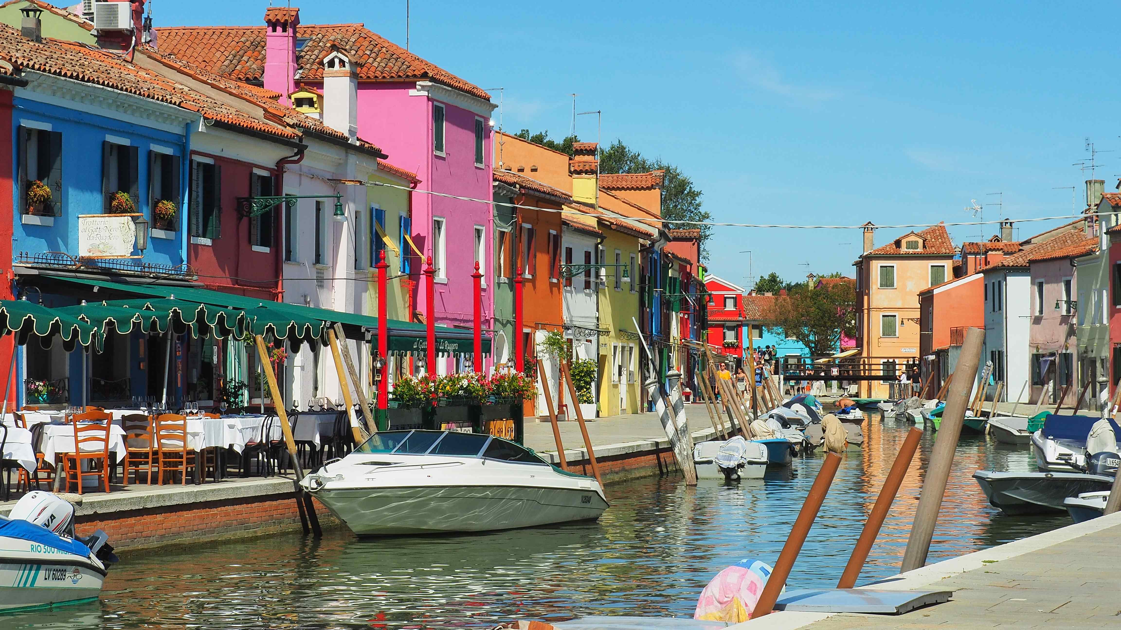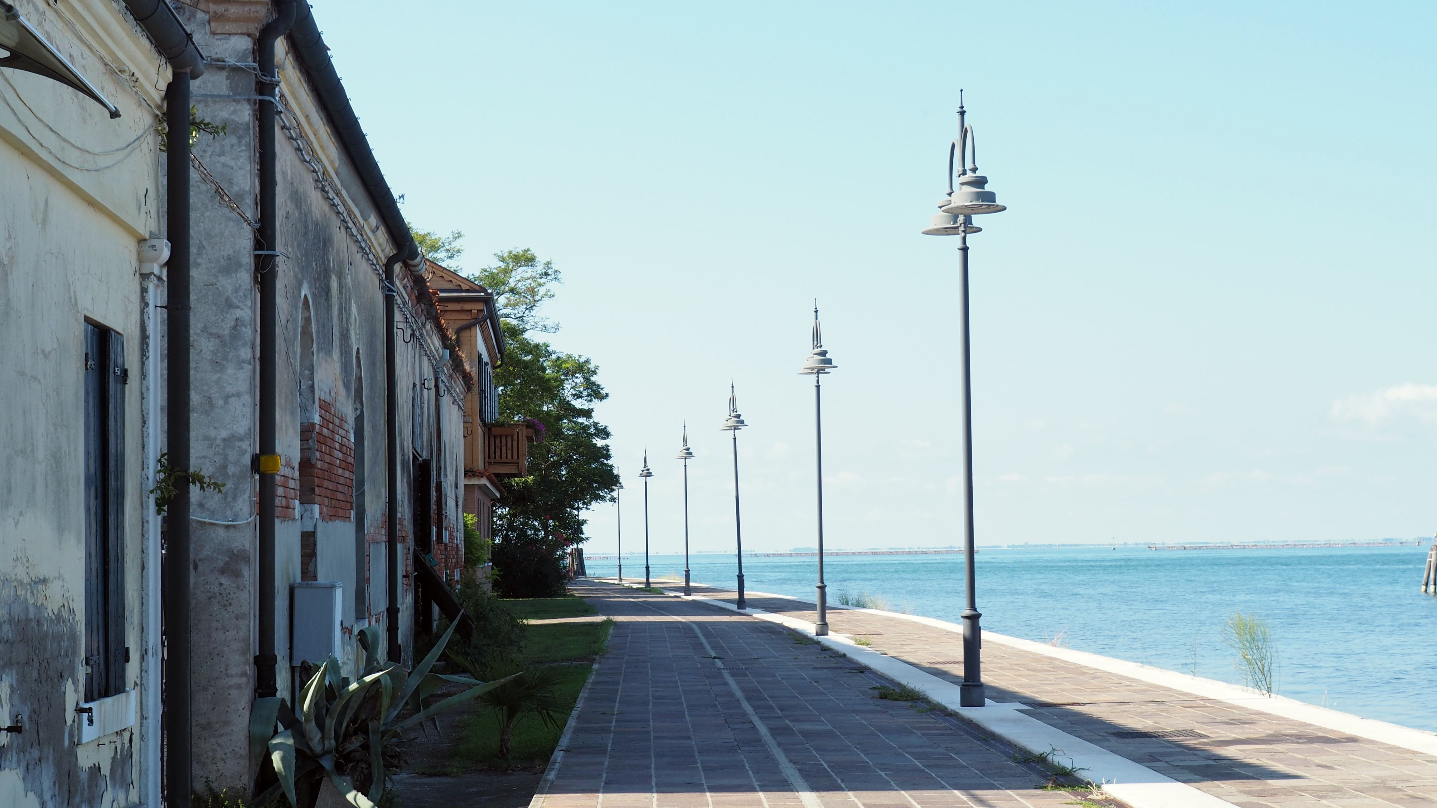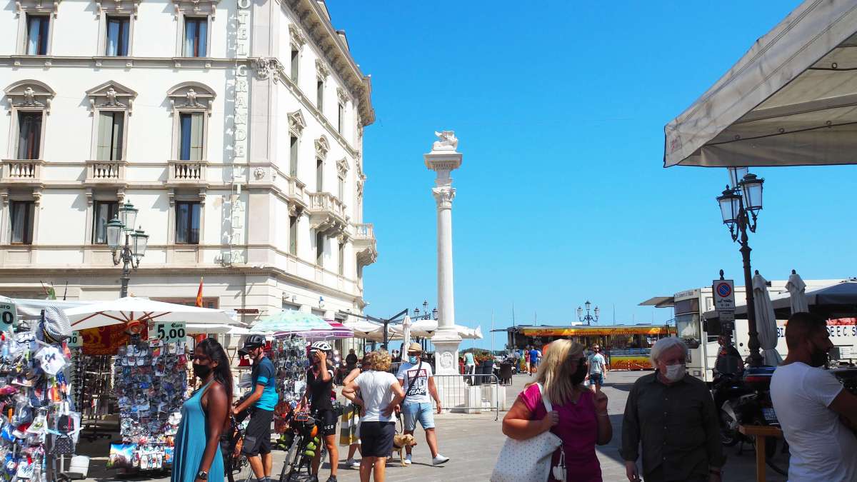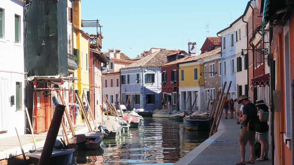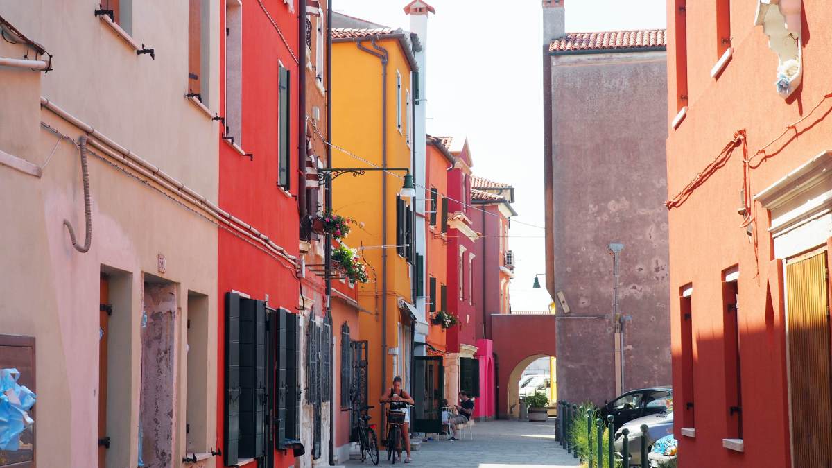 Tag 17: Heute Morgen bin ich zur Anlegestelle der Vaporetti in Treporti gefahren. Ich fand dort glücklicherweise einen offiziellen Fahrradparkplatz und schloss mein Fahrrad dort an. Die Vaporetti-Boote des Venezianischen Nahverkehrs befahren die Strecke Burano – Murano – Venedig. Ich hatte mich noch nicht entschieden, was ich alles sehen wollte, aber Burano und Murano waren die ersten Stationen, an denen ich aussteigen konnte. Bei wieder heißem Wetter fluteten die bisher in Venedig wegen Corona vermissten Touristen auf die Schiffe. Alle benahmen sich vorbildlich und trugen ihre Maske, manche sogar draußen auf den Straßen im Freien.