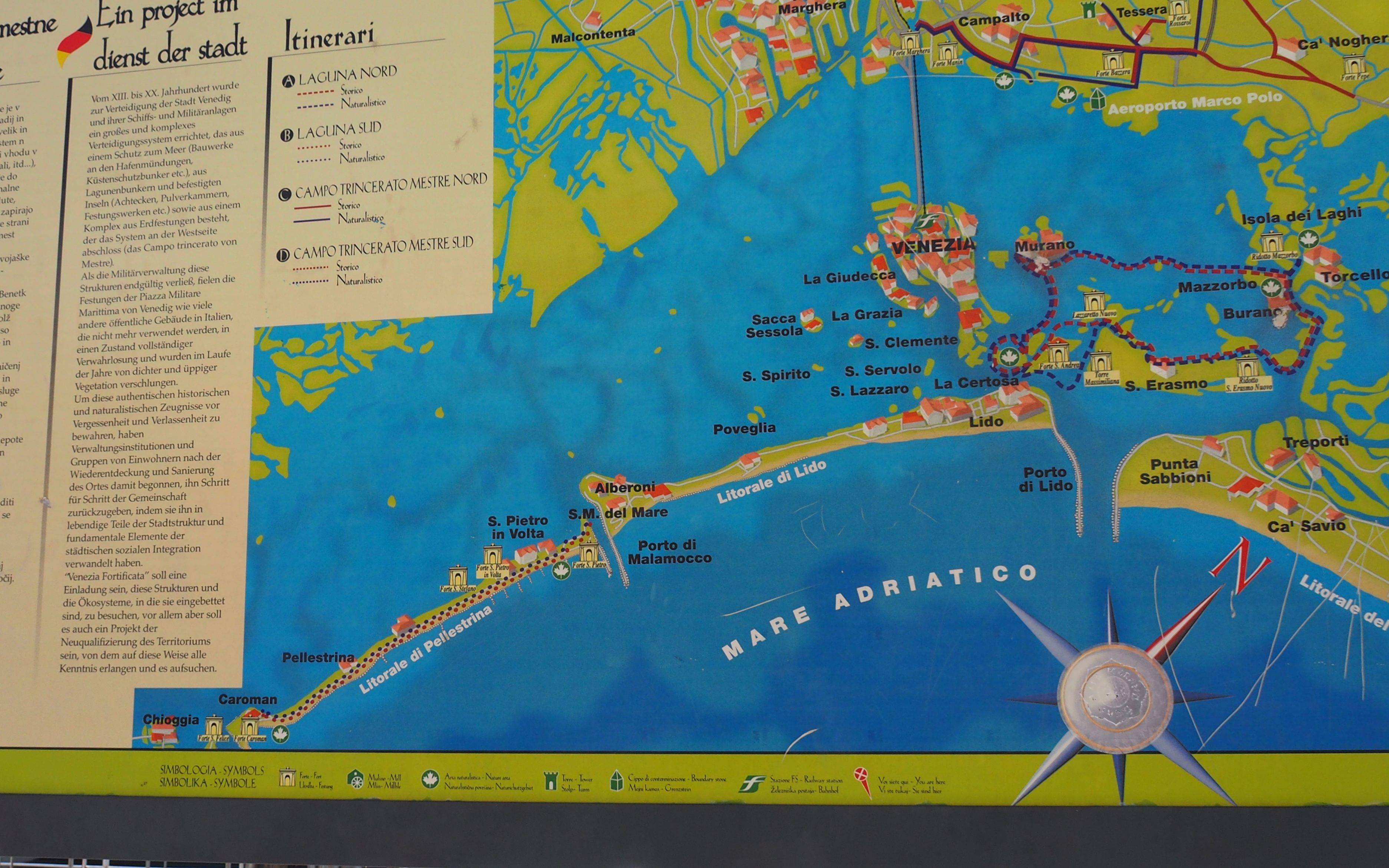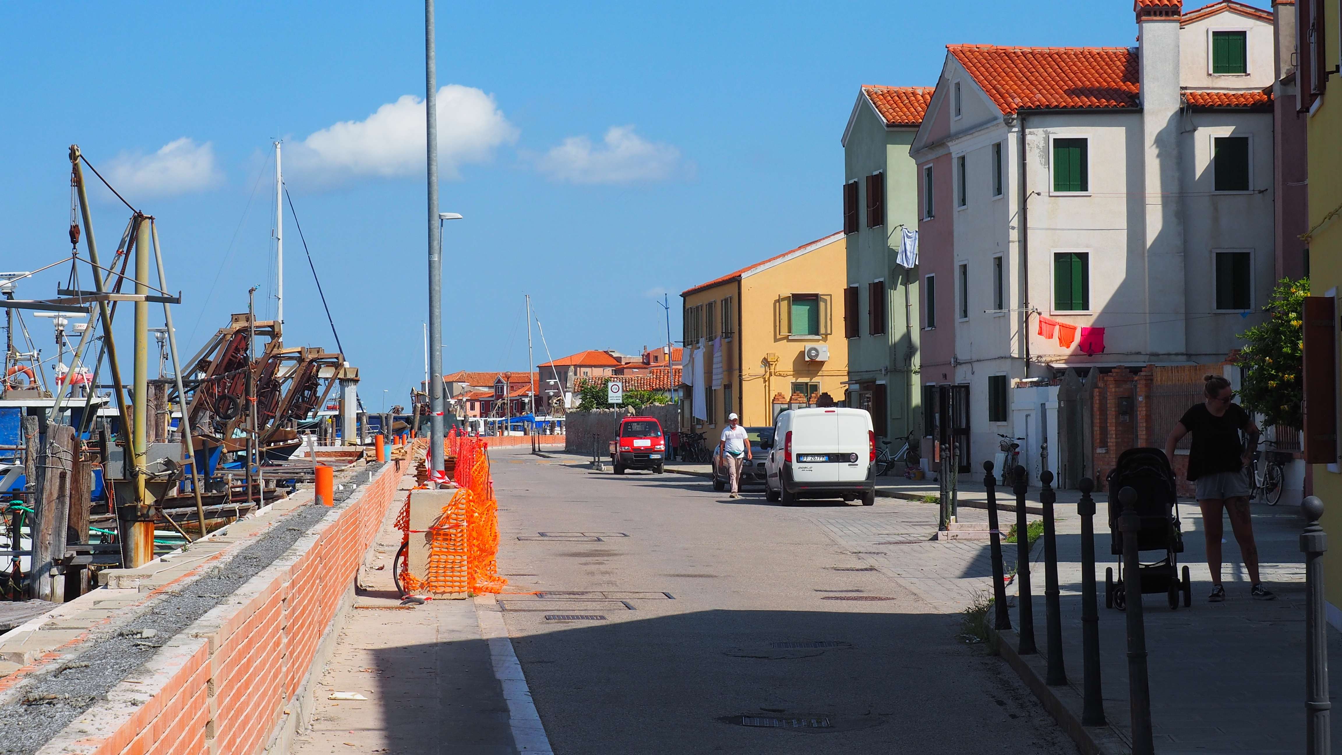 Ein paar Kilometer weiter nahm ich am Ende von Lido die nächste Fähre zur Insel Pellestrina. Die Insel ist oft nicht einmal 100 m breit, und etwa 8 km lang. Wenn man kein neues Ticket für die letzte Fähre (8,50 €) kaufen möchte, muss man sich beeilen, da die Tickets immer nur 75 Minuten gültig sind. Und der Landeplatz ist am südlichen Ende der Insel …