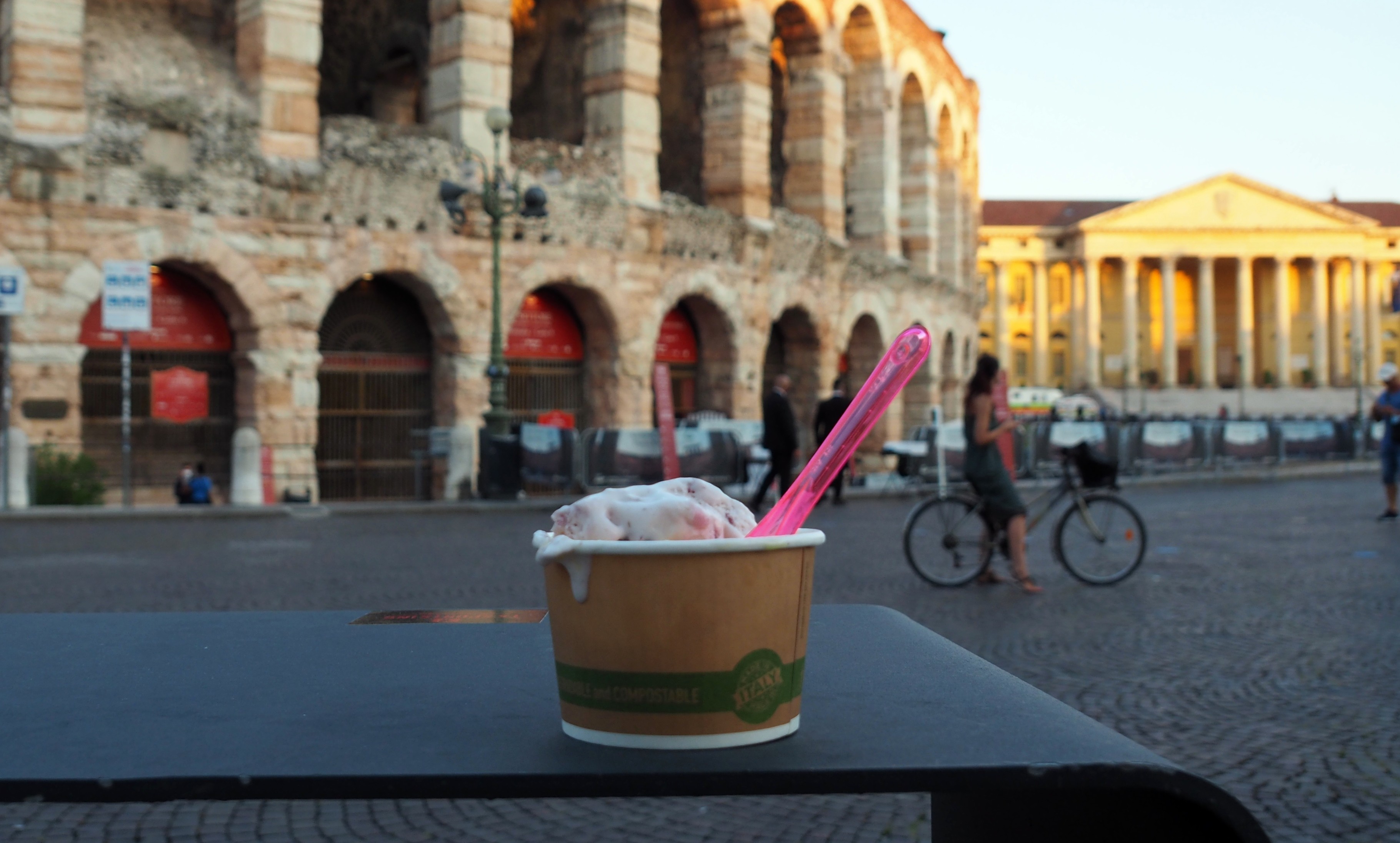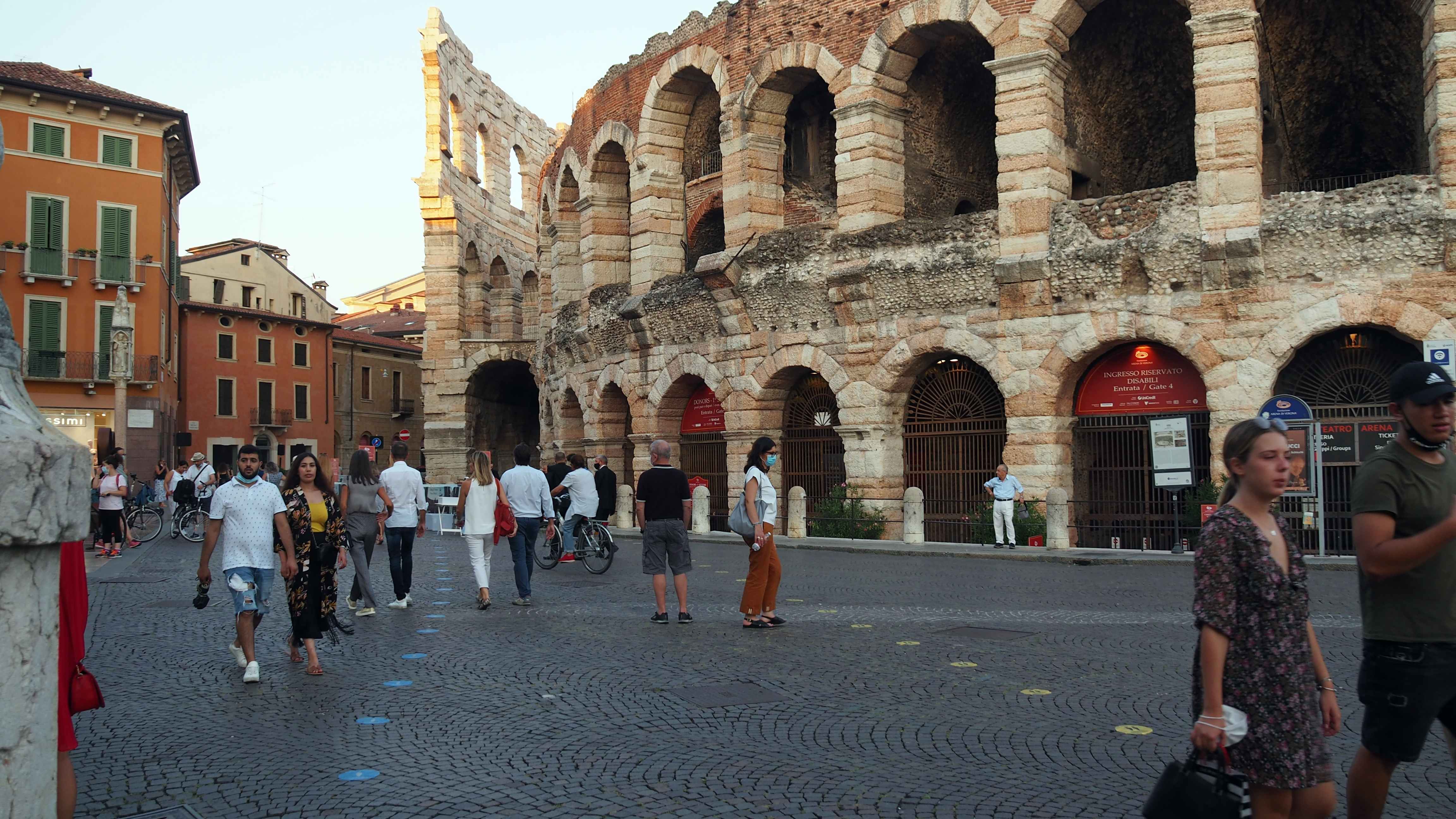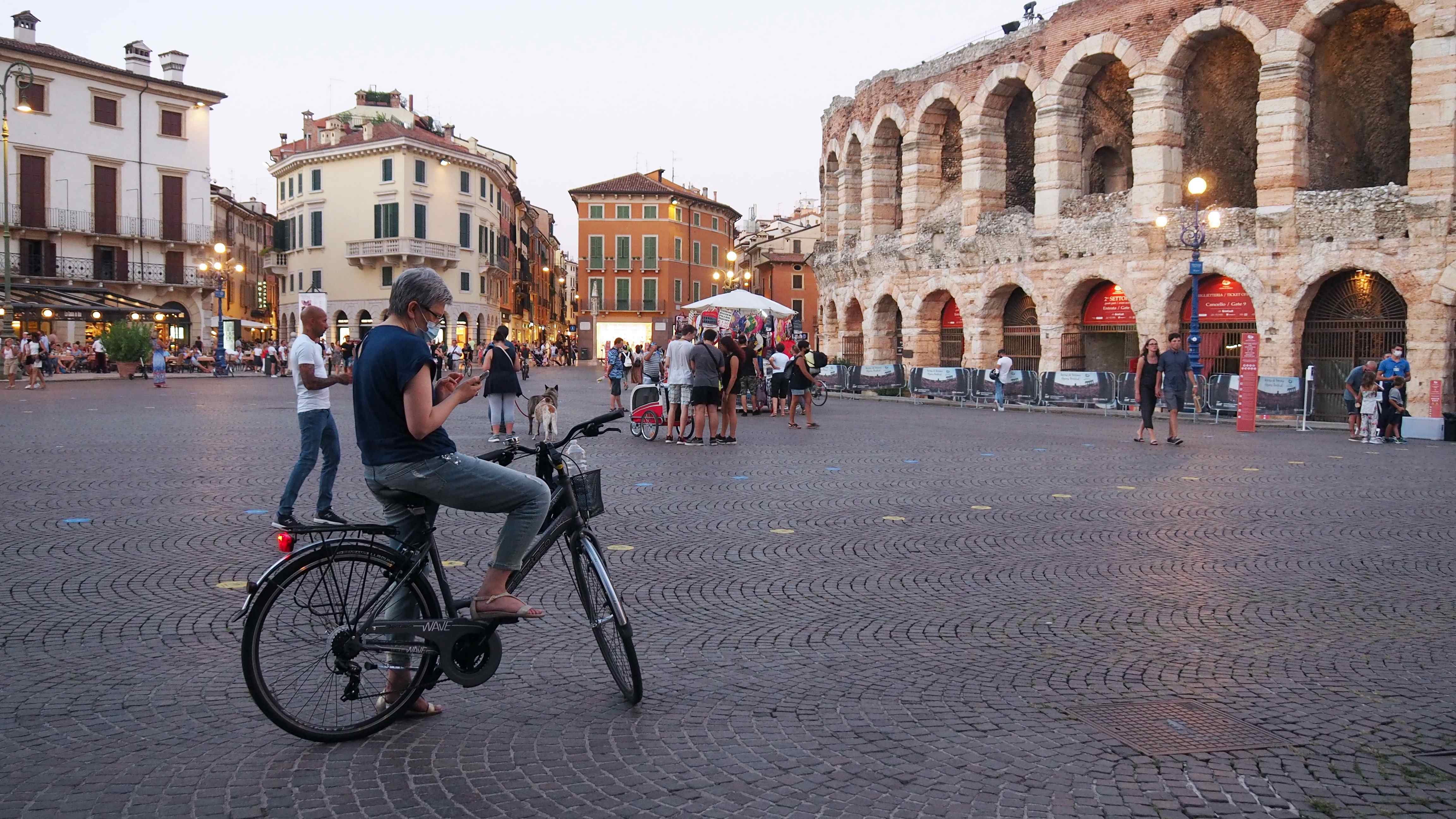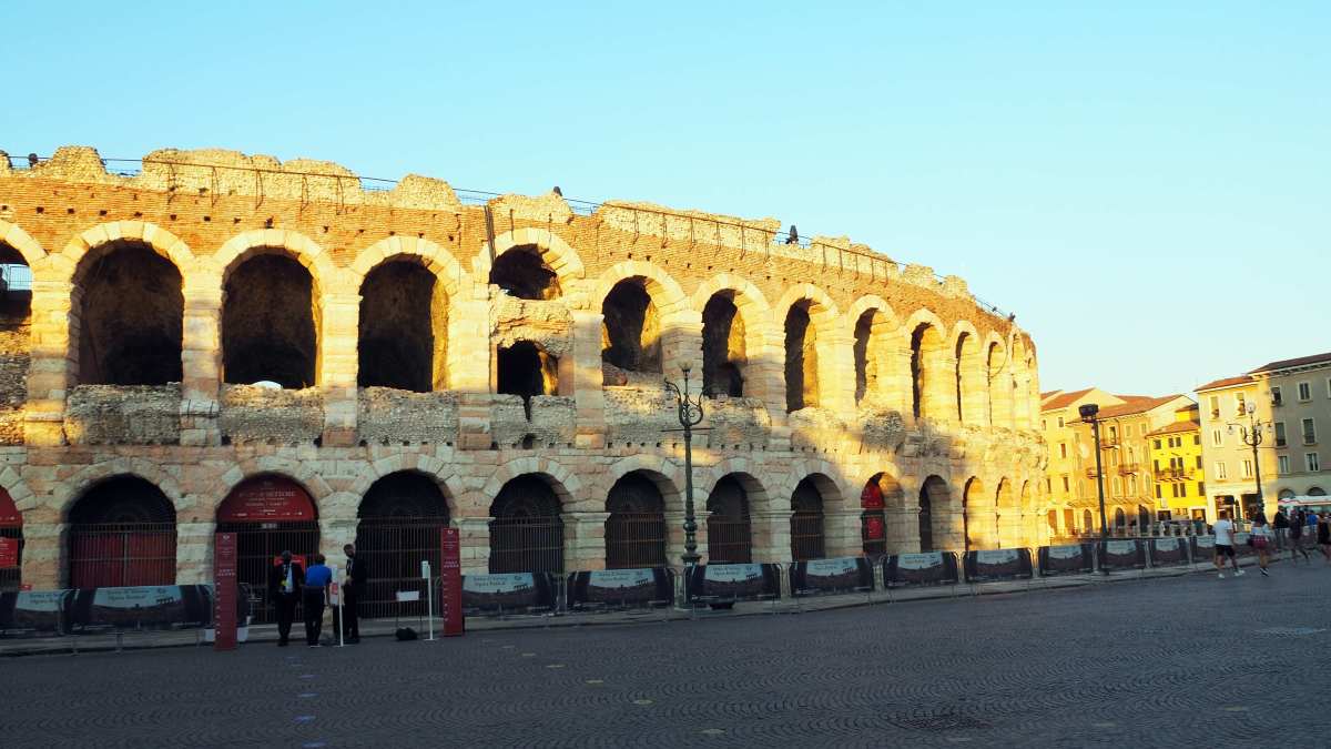 Endlich erreichte ich Verona und je näher ich dieser historischen Festivalstadt kam, desto mehr bekam ich die Großstadt mit viel zu viel Verkehr auf viel zu engen Straßen zu spüren. Trotzdem machte ich abends noch einen Ausflug zur berühmten Arena, die ich noch besichtigen wollte. Es gab aber später dort auch ein Konzert, daher ließ man niemanden mehr hinein. Dafür hätte ich ein Ticket online vorher buchen müssen, außerdem ist Puccini nicht gerade mein Fall … Nachdem ich meine Bilder des Tages bei einem Bier auf das Tablet hochgeladen hatte (wieder dauerte das eine gefühlte Ewigkeit), musste ich dringend ins Bett …