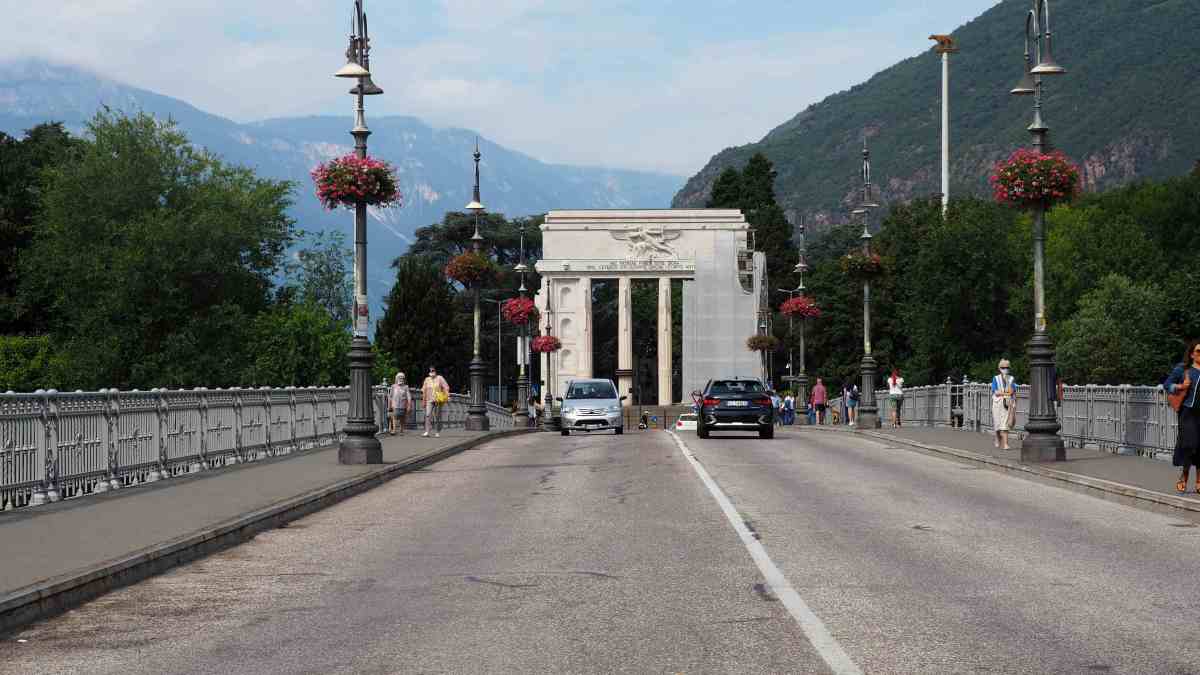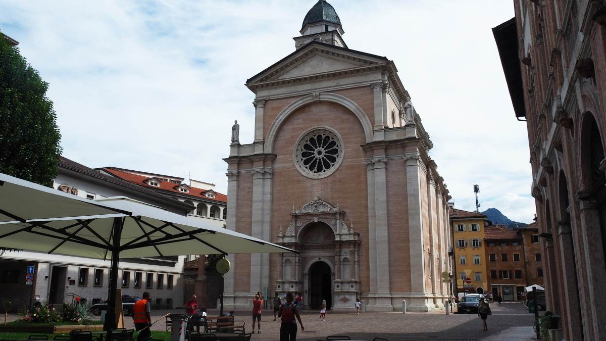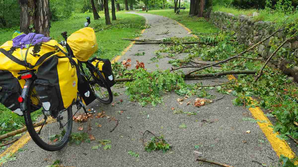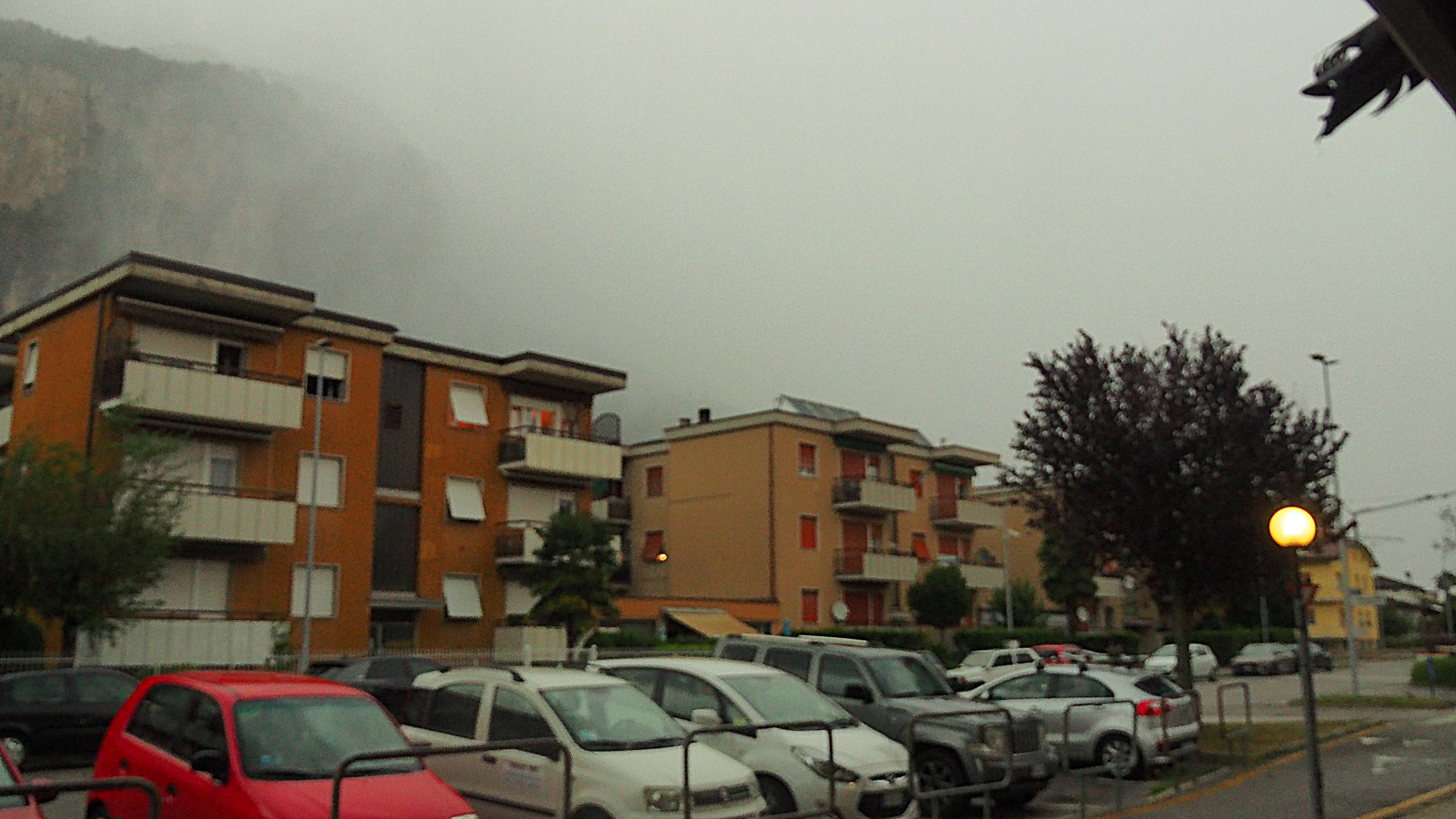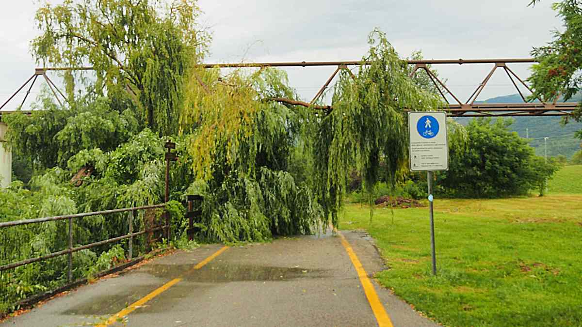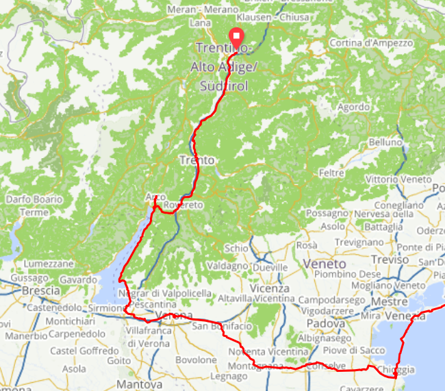 Die Wolken nahmen zu, aber noch sah es nicht bedrohlich aus. Das sollte sich schnell ändern. Ich holte die Regenbekleidung aus meiner Tasche, bereitete mich vor und schon fing es an zu regnen. Erst zögerlich, dann stärker und ich schaffte es gerade noch in den Eingang eines Hauses im Ort Mori. Eine gute Entscheidung, denn gegen dieses Gewitter half auch keine Regenbekleidung mehr. Ich musste mehr als eine Stunde ausharren und meinen AirBnB-Gastgeber darüber informieren, dass ich erst später ankomme. Die wollen nämlich immer wissen, wann man in etwa ankommt, was mich etwas nervt, denn es setzt mich unter Zeitdruck. Als ich dann weiterfahren konnte, sah ich, was passiert war. Immer wieder lagen Äste oder umgestürzte Bäume quer über der Radroute und blockierten meinen Weg. So wechselte ich für die letzten 31 km lieber auf die viel befahrene Nationalstraße. Mit zwei Stunden „Verspätung“ kam ich dann in Trient an …