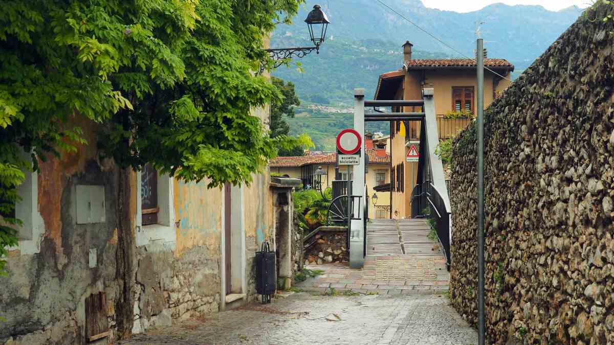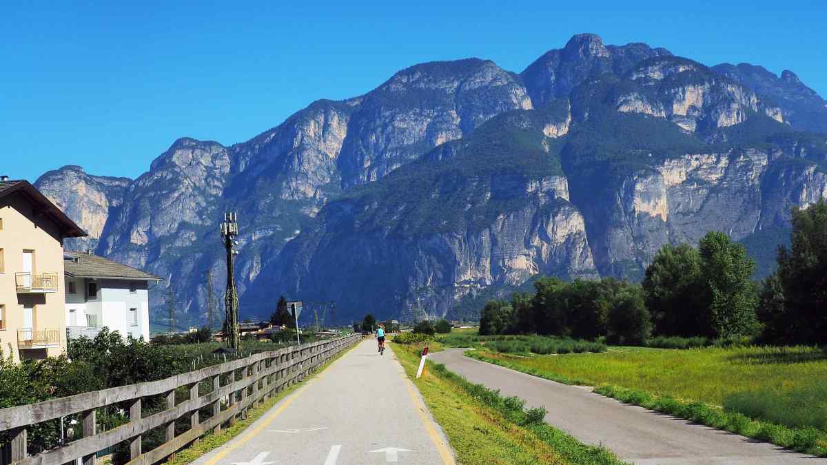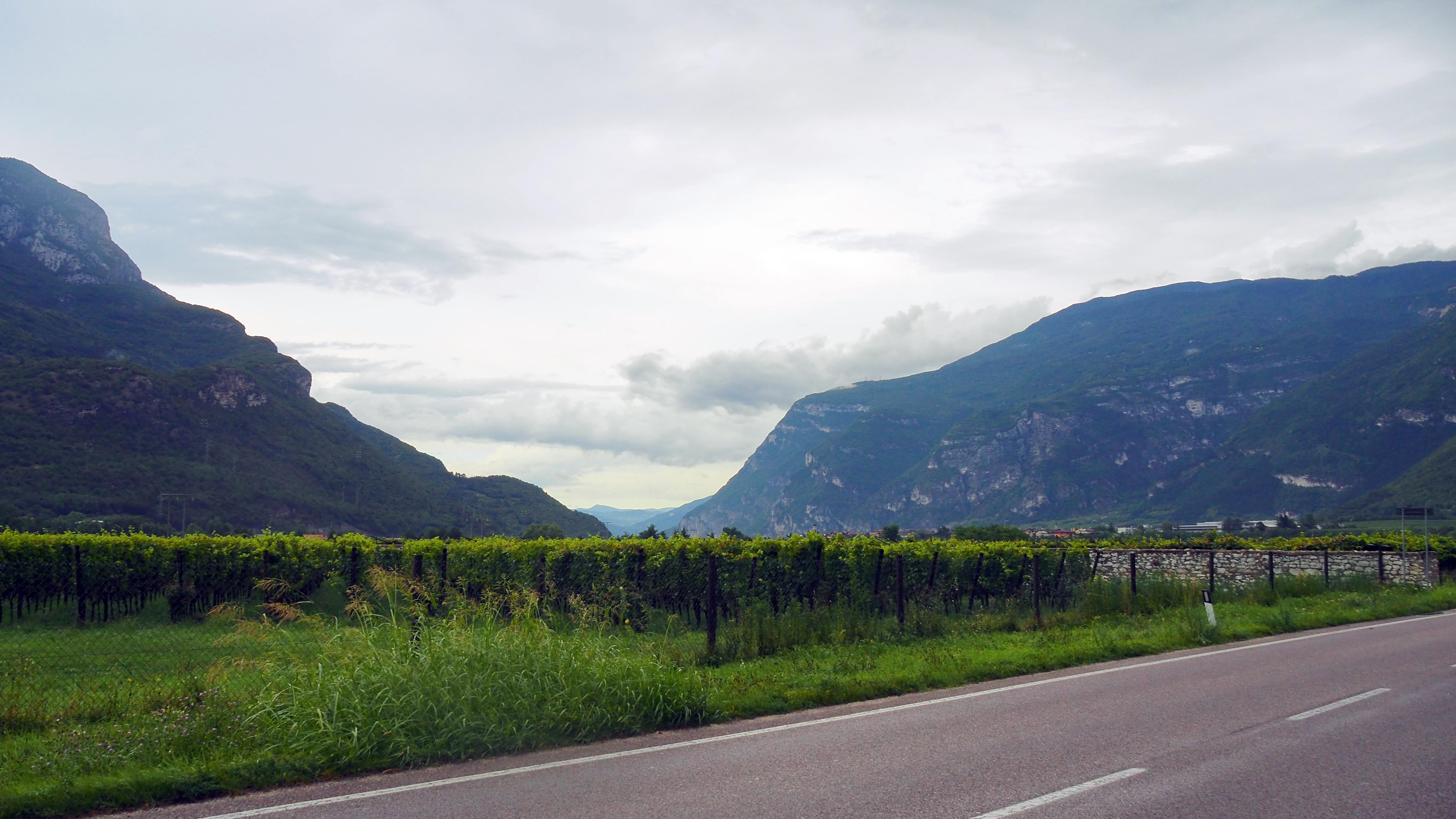 In Arco aß ich zu Mittag und überprüfte mit dem Tablet, wie die Strecke jetzt weitergehen würde. Ach je! Ich bin ja im falschen Tal gelandet! Das Sarca-Tal war nun wirklich nicht meine Strecke… Wenn ich hier weitergefahren wäre, hätte ich einen 800 m hohen Pass überqueren müssen, anstatt die nur 300 steilen Höhenmeter meiner ursprünglichen Strecke. Also wieder 7 km zurück. Und dann schob ich schwitzend mein Fahrrad die 9-12% Steigung hoch bis zur Spitze, ehe es wieder runterging. Zum Glück meistens auf einem separaten Radweg.