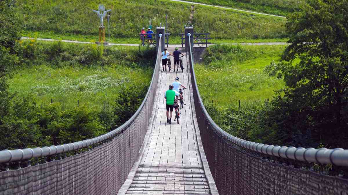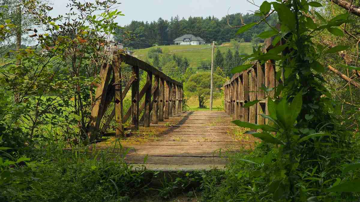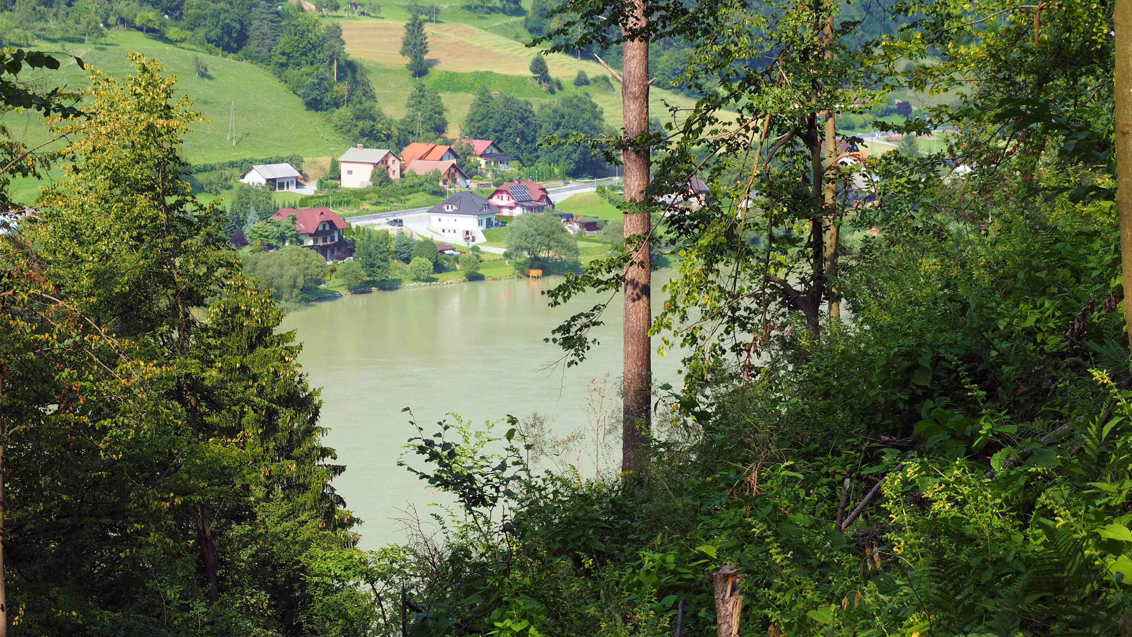 Tag 7 (Etappe 5) Heute Morgen fuhr ich durch die hügelige Landschaft in der Nähe des Flusses Drau (slowenisch Drava). Die Sonne brannte wieder den ganzen Tag, aber ich bekam auch etwas kühlenden Schatten, wenn meine Route durch den Wald führte. Dann ging es sogar über eine schwankende Seilbrücke!