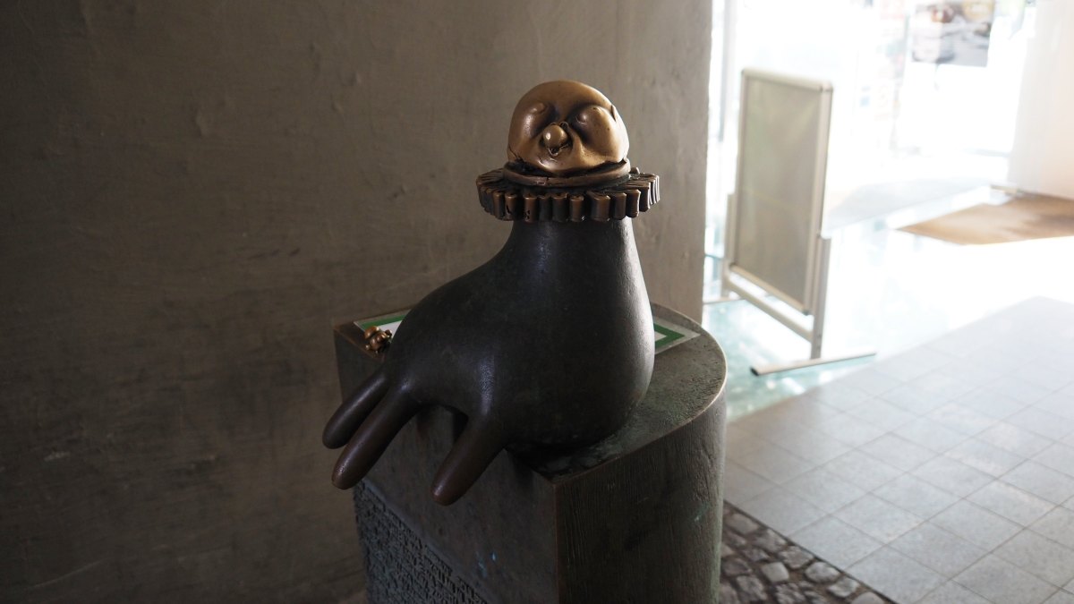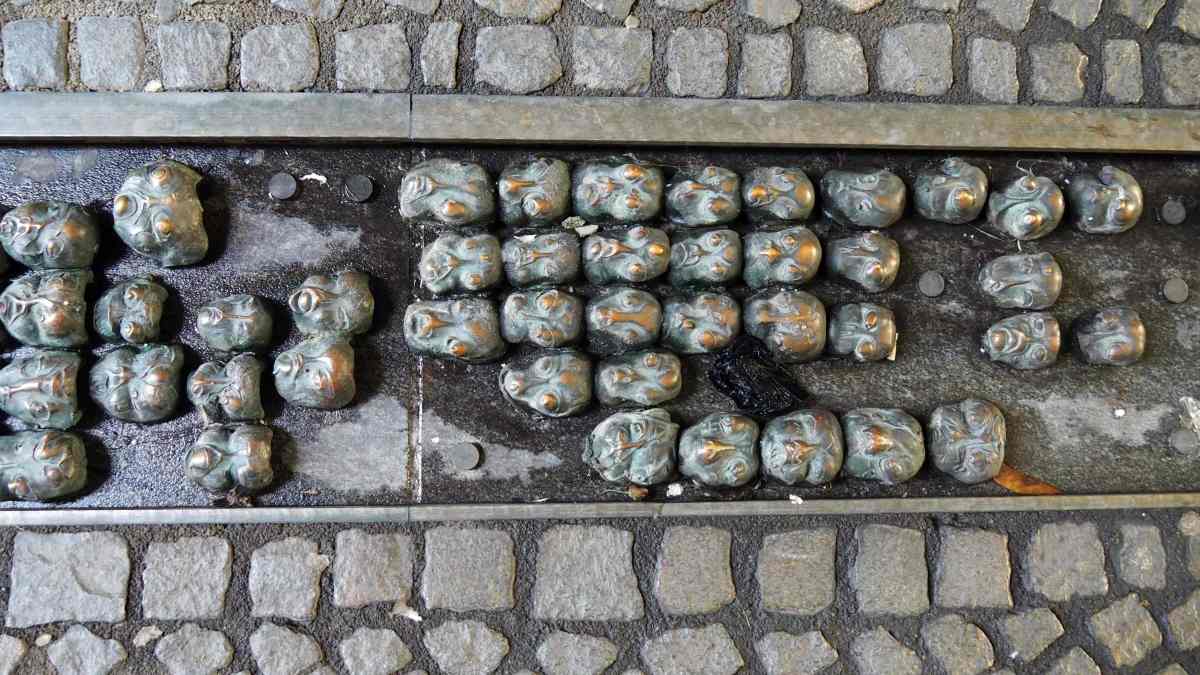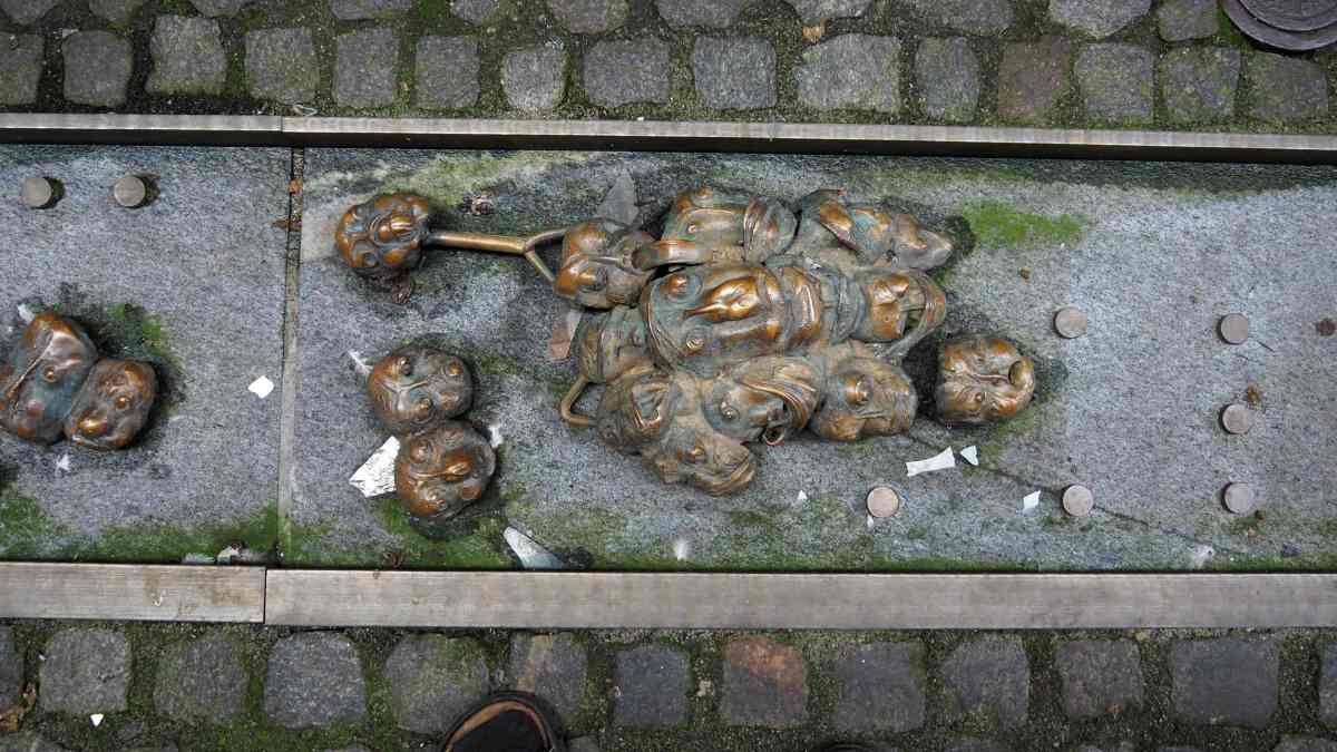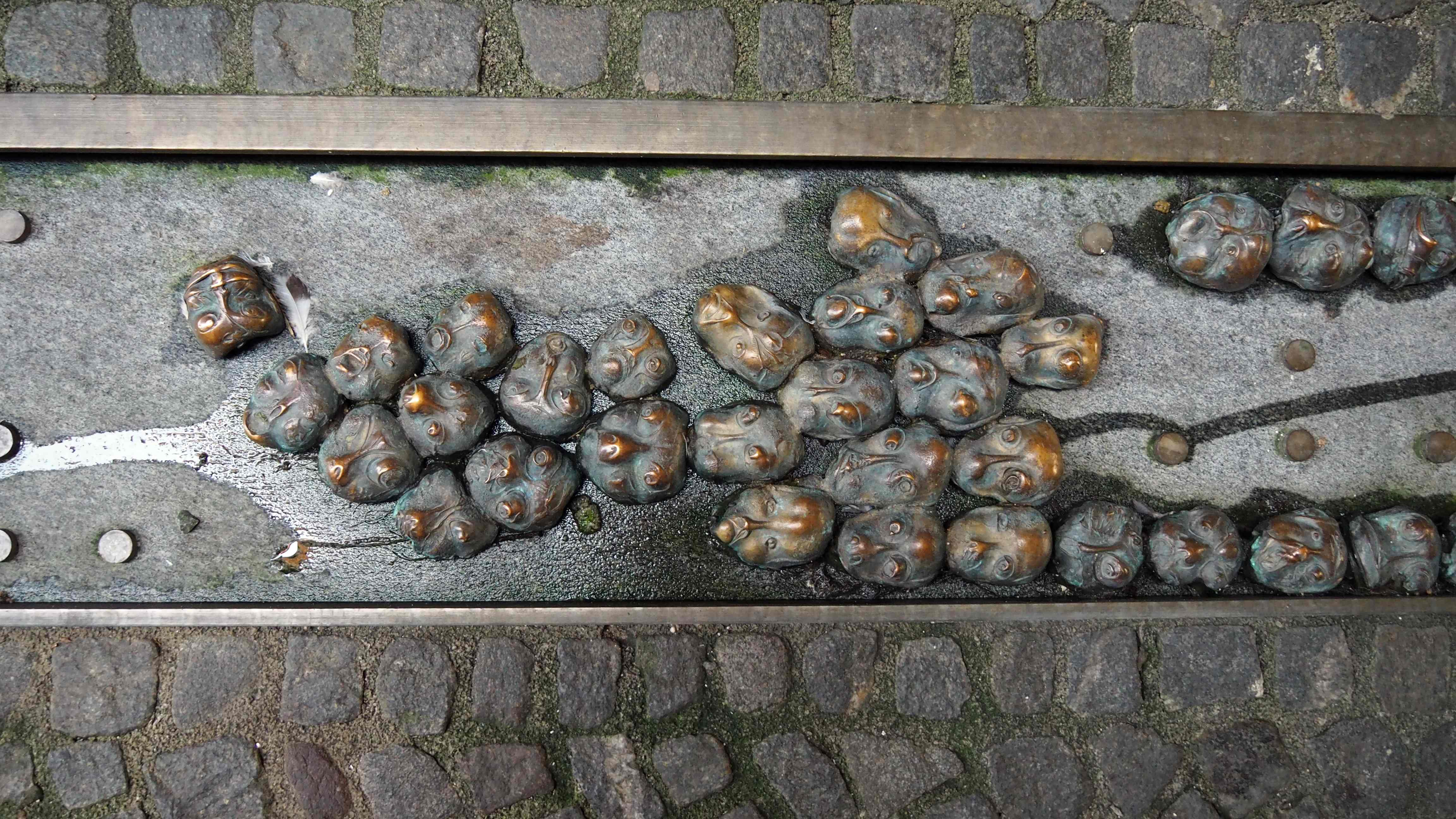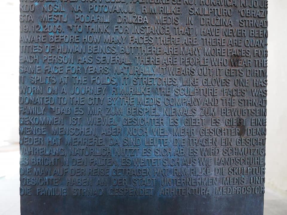 Und dann bog ich in eine winzige Seitengasse ab und fand ein interesantes Kunstwerk, die bronzene Darstellung eines Rilke-Textes. „Daß es mir zum Beispiel niemals zum Bewußtsein gekommen ist, wieviel Gesichter es giebt. Es giebt eine Menge Menschen, aber noch viel mehr Gesichter, denn jeder hat mehrere. Da sind Leute, die tragen ein Gesicht jahrelang, natürlich nutzt es sich ab, es wird schmutzig, es bricht in den Falten, es weitet sich aus wie Handschuhe,