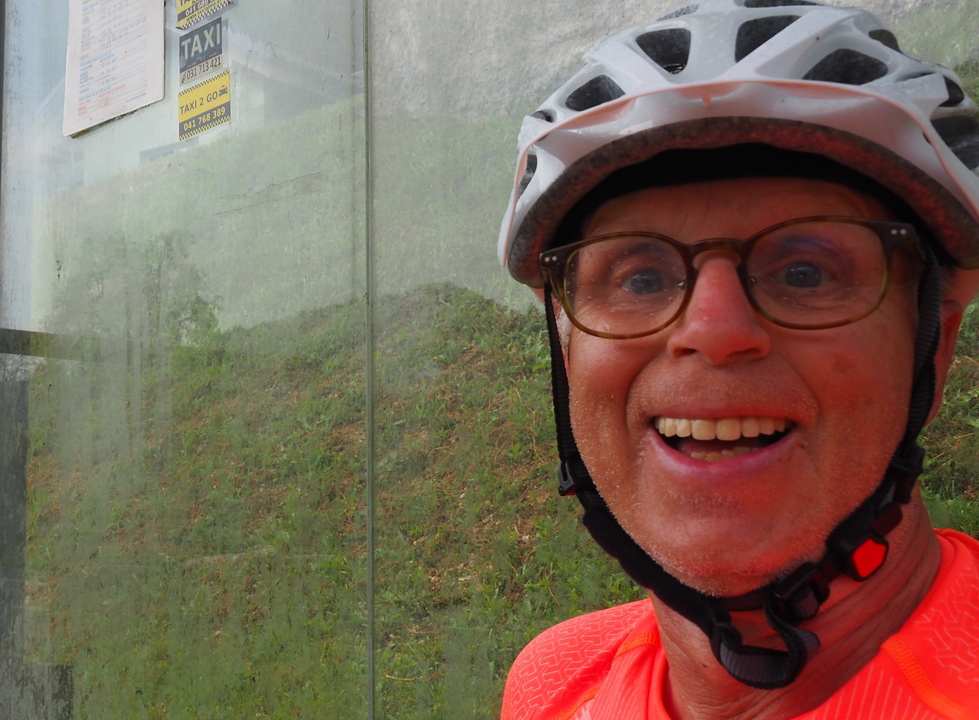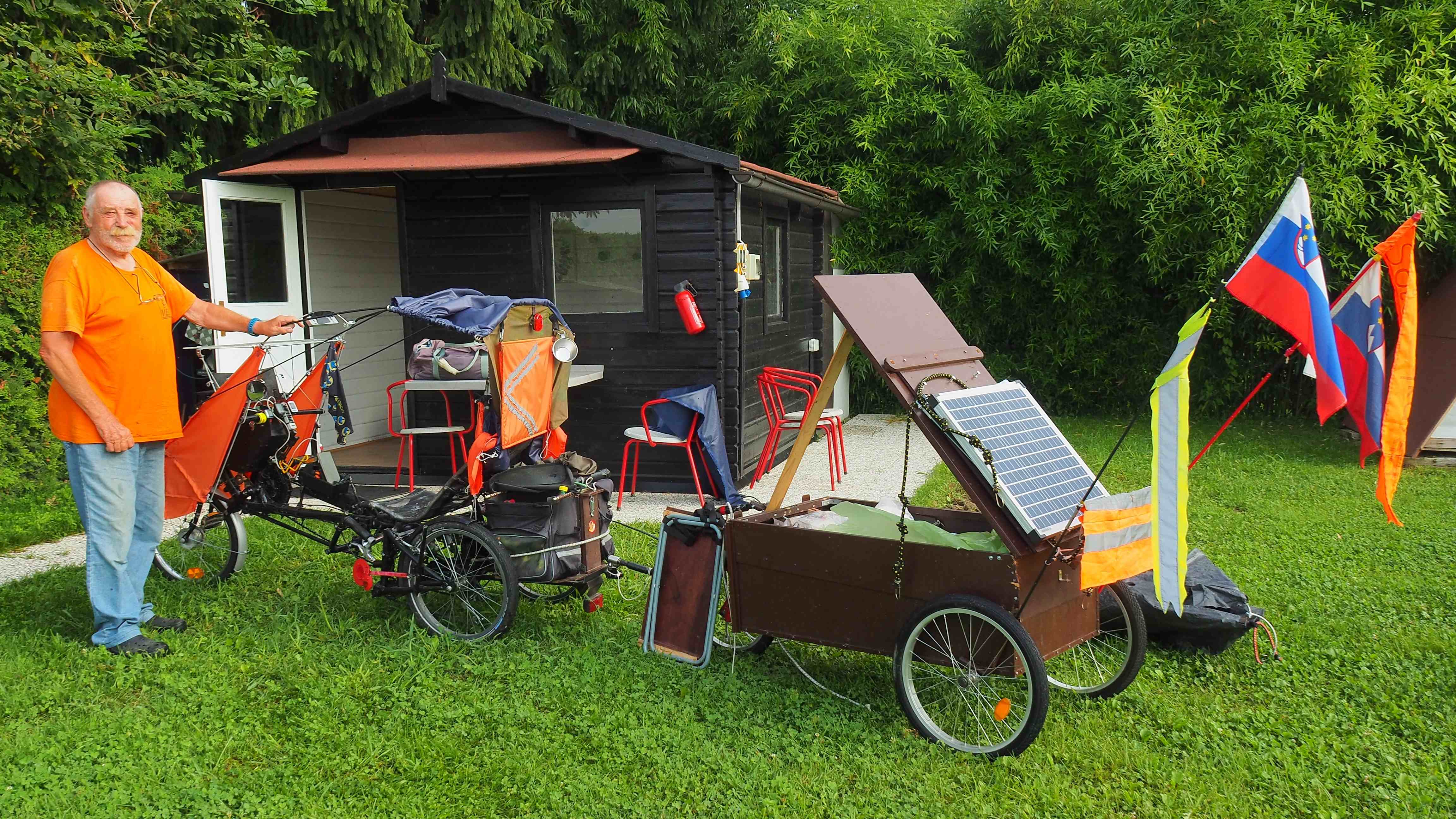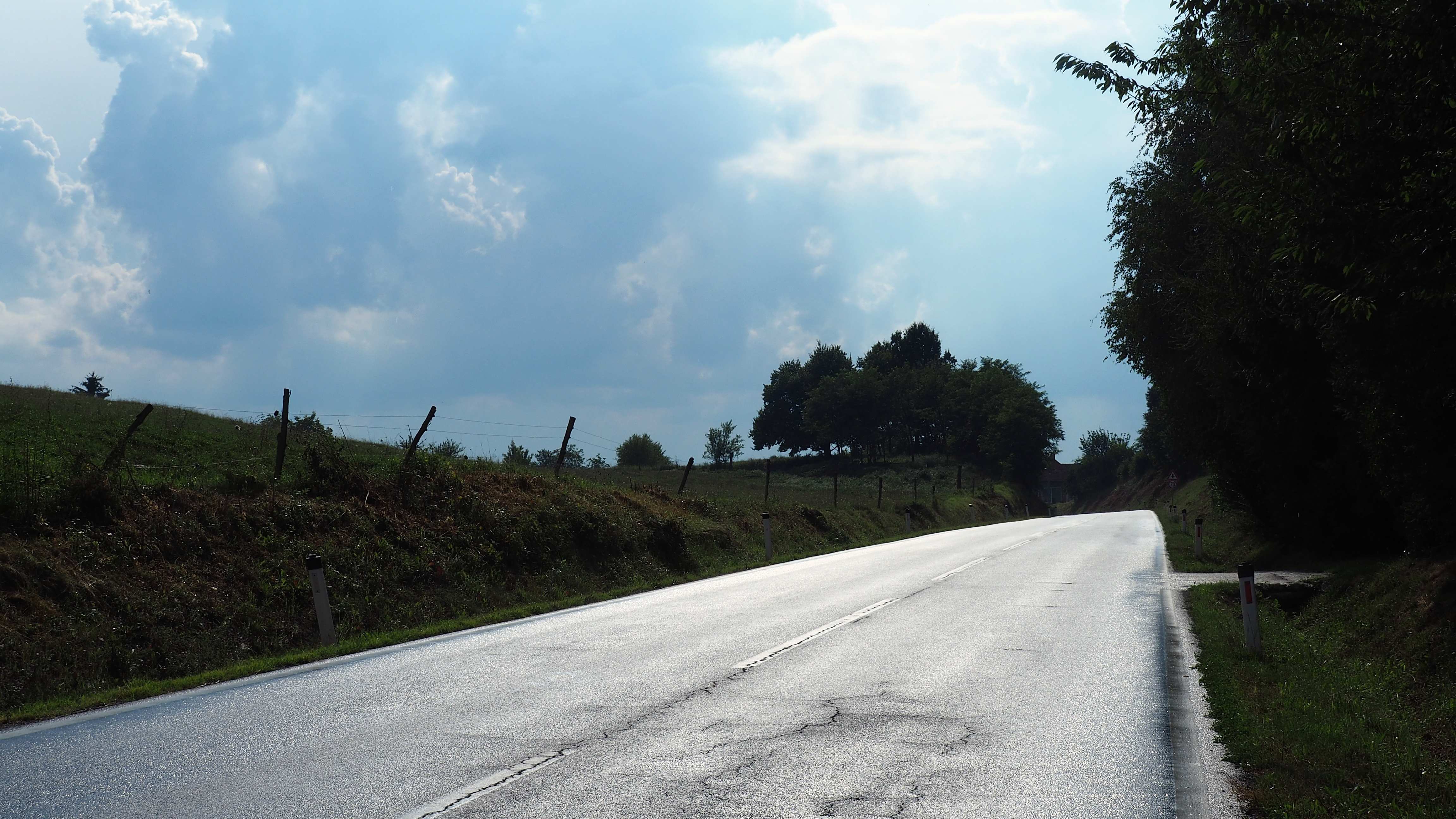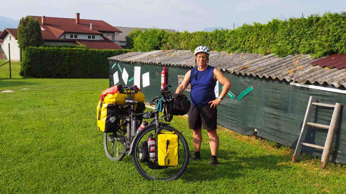 Von nun an geht es hauptsächlich nach Westen. Ich fuhr durch die malerische Landschaft der slowenischen Steiermark und hatte tatsächlich eine Weile eine flache Strecke, bis ich über einen Gebirgsausläufer fahren musste. Kurz vor einer 14% Steigung suchte ich Schutz vor aufkommendem Regen unter einem Vordach. Der Hausbesitzer registrierte das und bat mir dann an, doch lieber in der Veranda zu warten. Er riet mir zu einer anderen Strecke. Das war dann zwar ein Umweg, aber weniger schwierig zu fahren. Übernachtung auf dem Campingplatz von Celje.