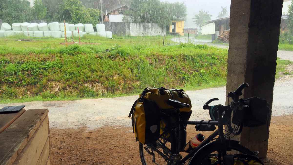 Tag 12 (Etappe 9). Heute gab es einige unangenehme Überraschungen. Zuerst blieb ich mit den vorderen Packtaschen in einer Hecke stecken, stürzte und verstauchte mir meinen linken Ringfinger. Abgesehen davon musste ich zum Glück nur den Kotflügel wieder neu befestigen. Gegen 13 Uhr begann es zu donnern, zunächst zu schüchtern, als dass ich es ernst nehmen wollte, aber dann fing es richtig an und ich fand Schutz unter dem Vordach einer Scheune. Es strömte nur so vom Himmel. Als es dann irgendwann aufzuhören schien, fuhr ich vorsichtig weiter und schaute immer wieder gen Himmel, denn es wollte nicht wirklich aufhören. Diese fiese Gewitterzelle hatte sich wirklich an den Bergen festgekrallt und offensichtlich immer wieder neues Futter bekommen. Ständig rieselte es vom Himmel und es donnerte dazu dramatisch. Erst als ich auf dem Campingplatz ankam, hatte es endlich aufgehört. Nachdem ich mein Zelt aufgebaut hatte, konnte ich meine Mails lesen und fand eine Katastrophenmeldung von meinem Airbnb-Gastgeber in Ljubljana auf meinem Tablet: Ich hatte vergessen, das Schlüsselbund wieder in seinen Briefkasten zu stecken. Oh je, jetzt erst fühlte ich es in meiner Hosentasche. Typisch ich! X-mal hatte er versucht mich zu erreichen. Jetzt drohte er mit einer Schadensersatzforderung von 145 €, wenn nicht … Okay, wir haben dann telefoniert und ich habe ihm eine Lösung versprochen. Und tatsächlich hat die Chefin des Campingplatzes mit Pension auf dem ich gerade war, zugestimmt, ihm den Schlüsselring zurückzusenden. Gleich morgen. Ich bedankte mich bei ihr und gab ihr 10 € für eventuelle Unkosten. Vermutlich kennt sie als „Kollegin“ ja sowas…