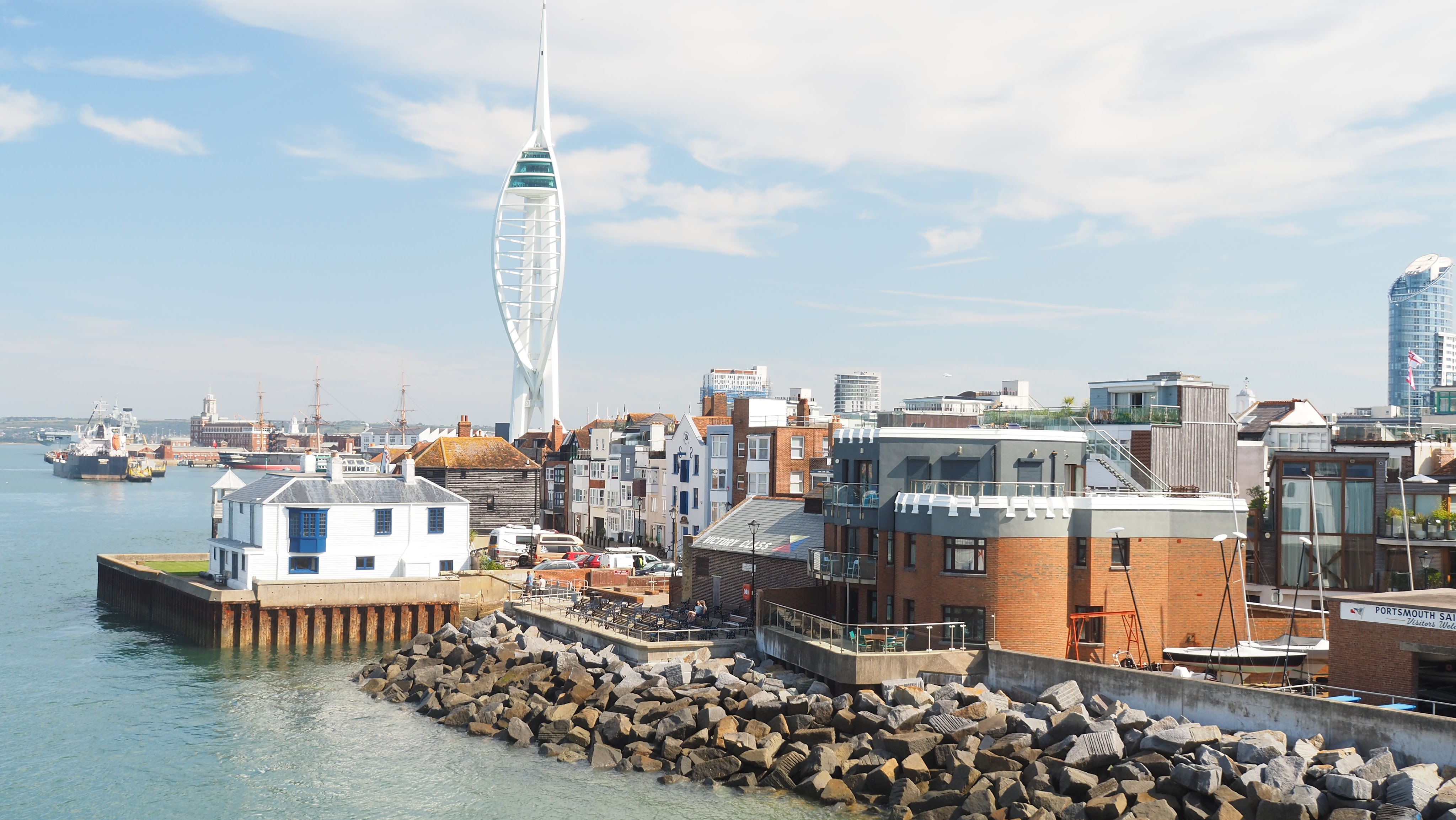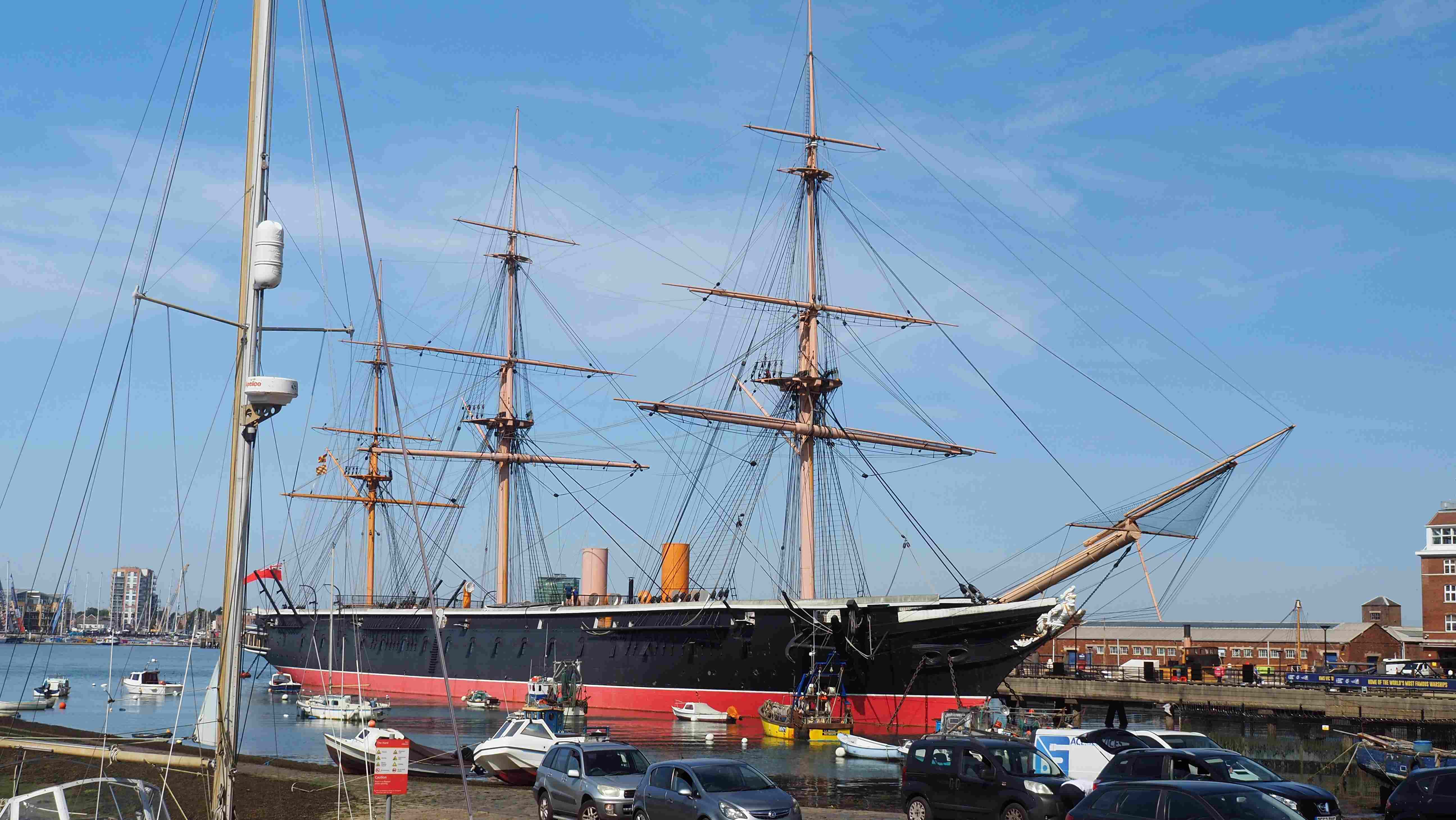 Jetzt wieder zur Fähre und hinüber nach Portsmouth. 11 km Überfahrt und ein markantes städtisches Panorama mit einem futuristischen Aussichtsturm. Und einem Blick vom Schiff aus in ein paar malerische Altstadtstraßen. Ich fuhr am Hafen entlang und entdeckte von weitem Admirals Nelsons Segelschiff, die HMC Victory, die hier als Museum liegt.
