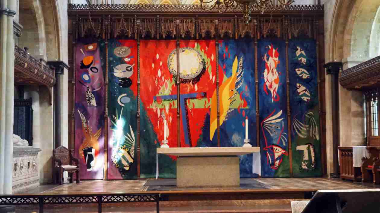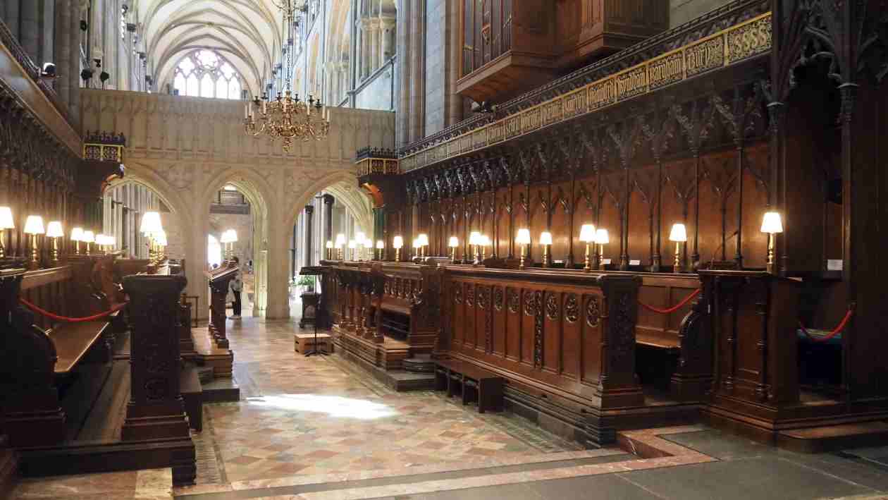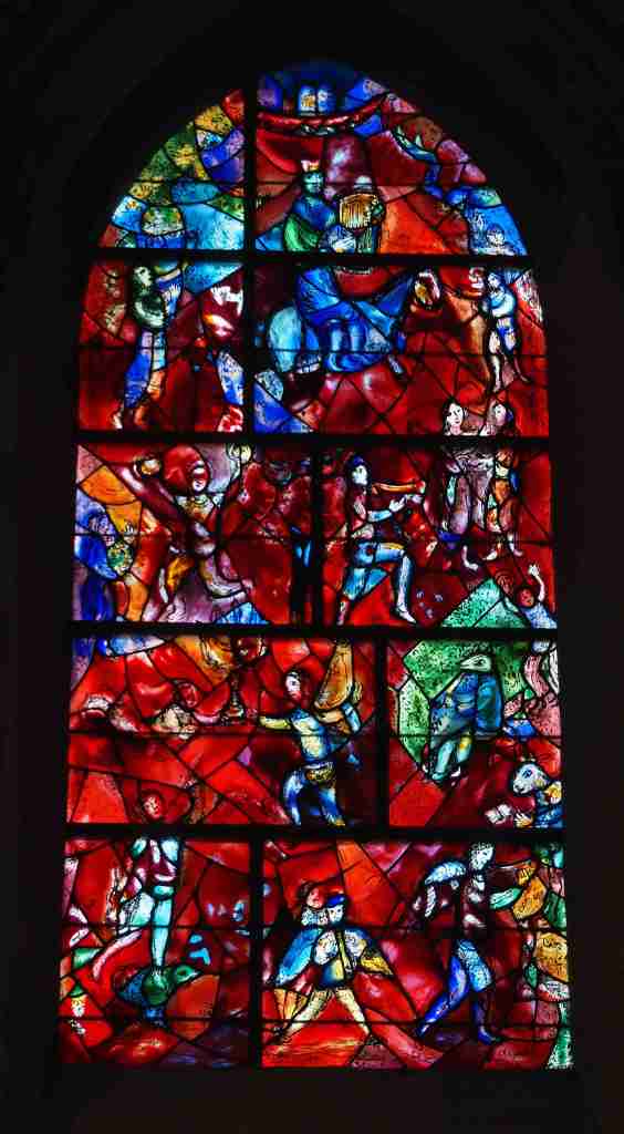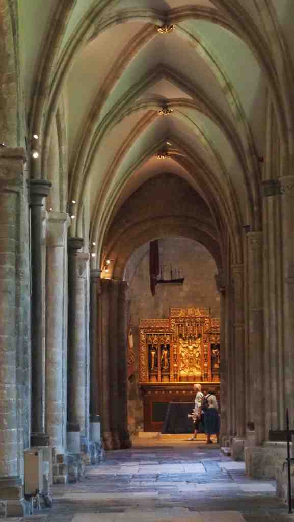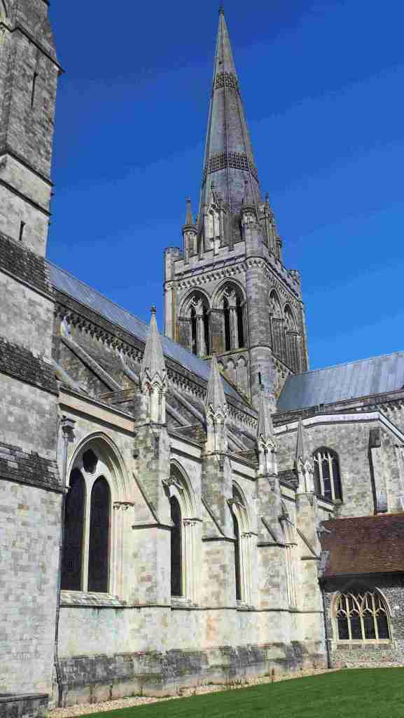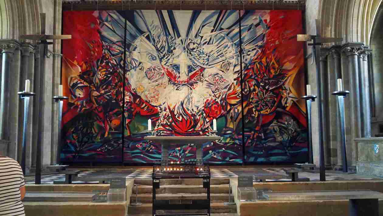 Die 995 Jahre alte Kathedrale, vor der der Heilige Richard, der die Normannen christianisiert hat, als überlebensgroßes Denkmal steht, hat eine bemerkenswerte Länge. An das Hauptschiff reiht sich der Chor an, darüber an der Schnittstelle zum Hauptschiff der im 19.Jahrhundert eingestürzte und wieder aufgebaute Vierungsturm und anschießend noch die Marienkapelle. Am Hochaltar zwischen Chor und Marienkapelle finden sich ein Wandteppich – auf der Vorderseite von John Piper, auf der Rückseite von der deutschen Künstlerin Ursula Benker-Schirmer. Und der Höhepunkt war für mich ein originales Glasfenster über den 115.Psalm von Marc Chagall.