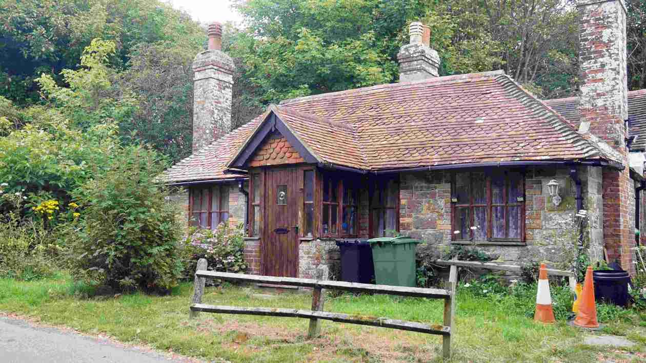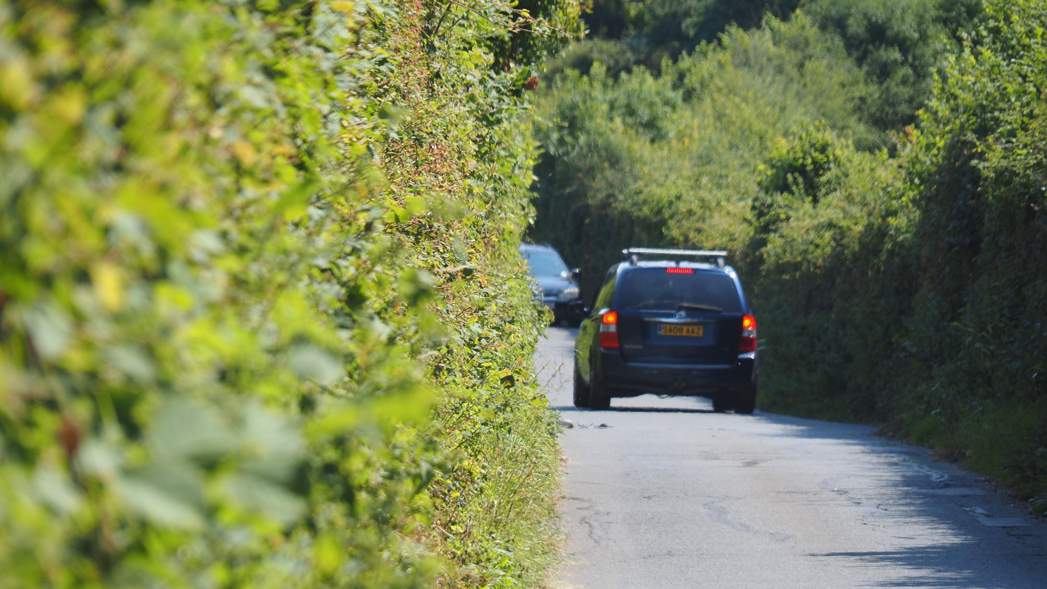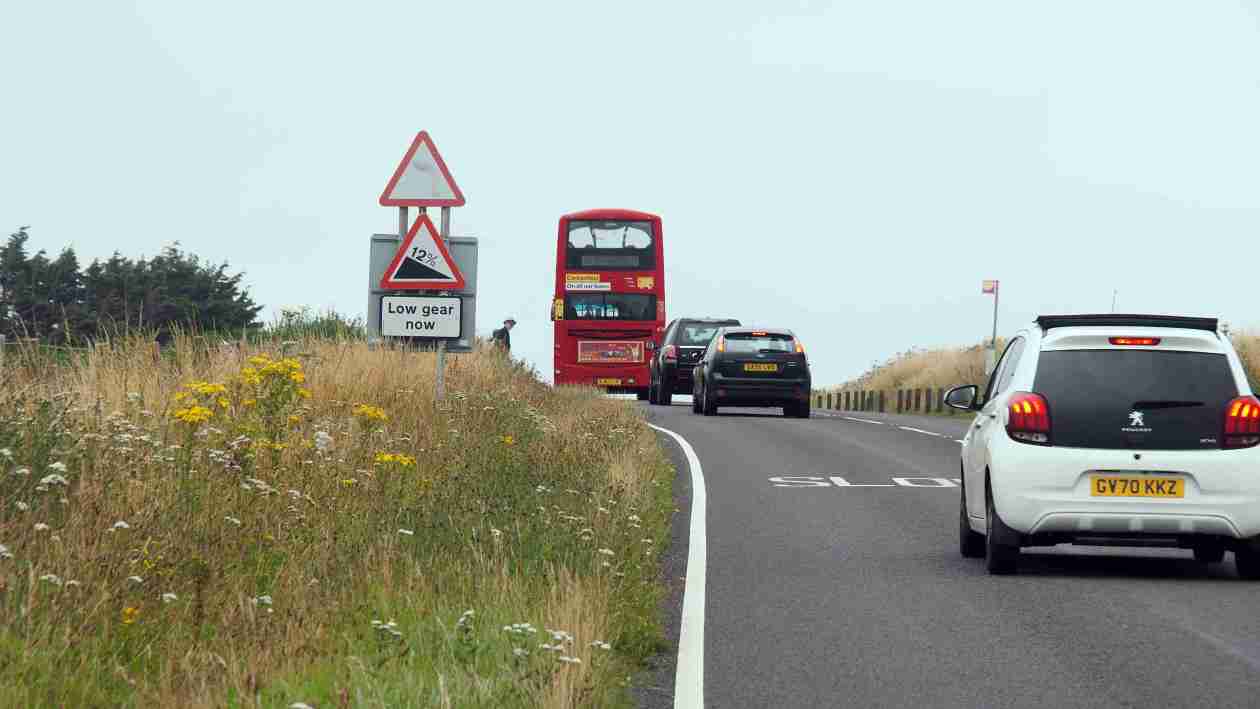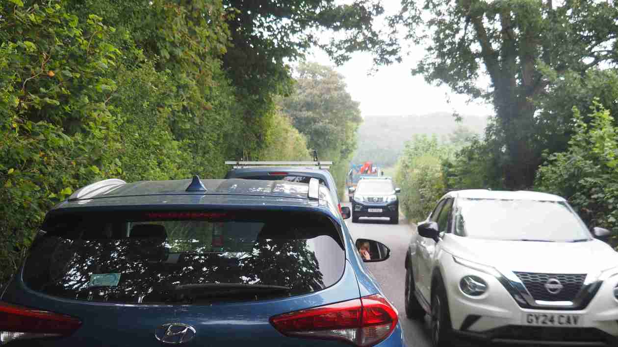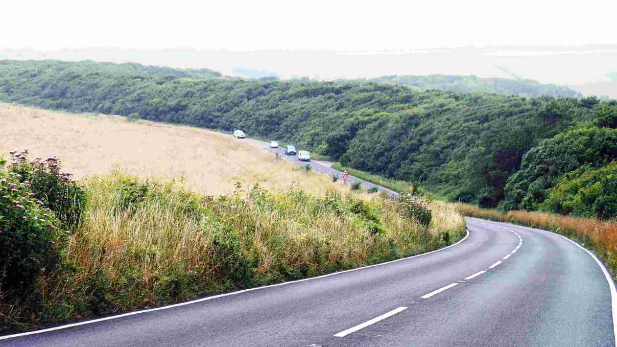 Jetzt, schließlich oben angekommen nach links auf den Calbourne Road – und dann passierte es: Hier war der Verkehr stärker und ich wich zu sehr nach links aus und geriet mit der vorderen linken Seitentasche ins Gebüsch, blieb hängen und das Rad kippte weg, ich konnte mich gerade noch nach rechts heraushieven, zog das Fahrrad hoch und sah das Malheur: Bei der dieser Seitentasche war die Aufhängung gebrochen und hing nur noch an einer Befestigung. Ich schob ein Stück weiter an eine weniger gefährliche Stelle und befestigte dass erst mal wieder irgendwie provisorisch. Es gibt oft, wie an dieser Straße hier, keinen freien Sicherheitsstreifen oder gar einen Fuß- oder Radweg zwischen Fahrbahn und Büschen oder Gebäuden. „Eng“-land eben…