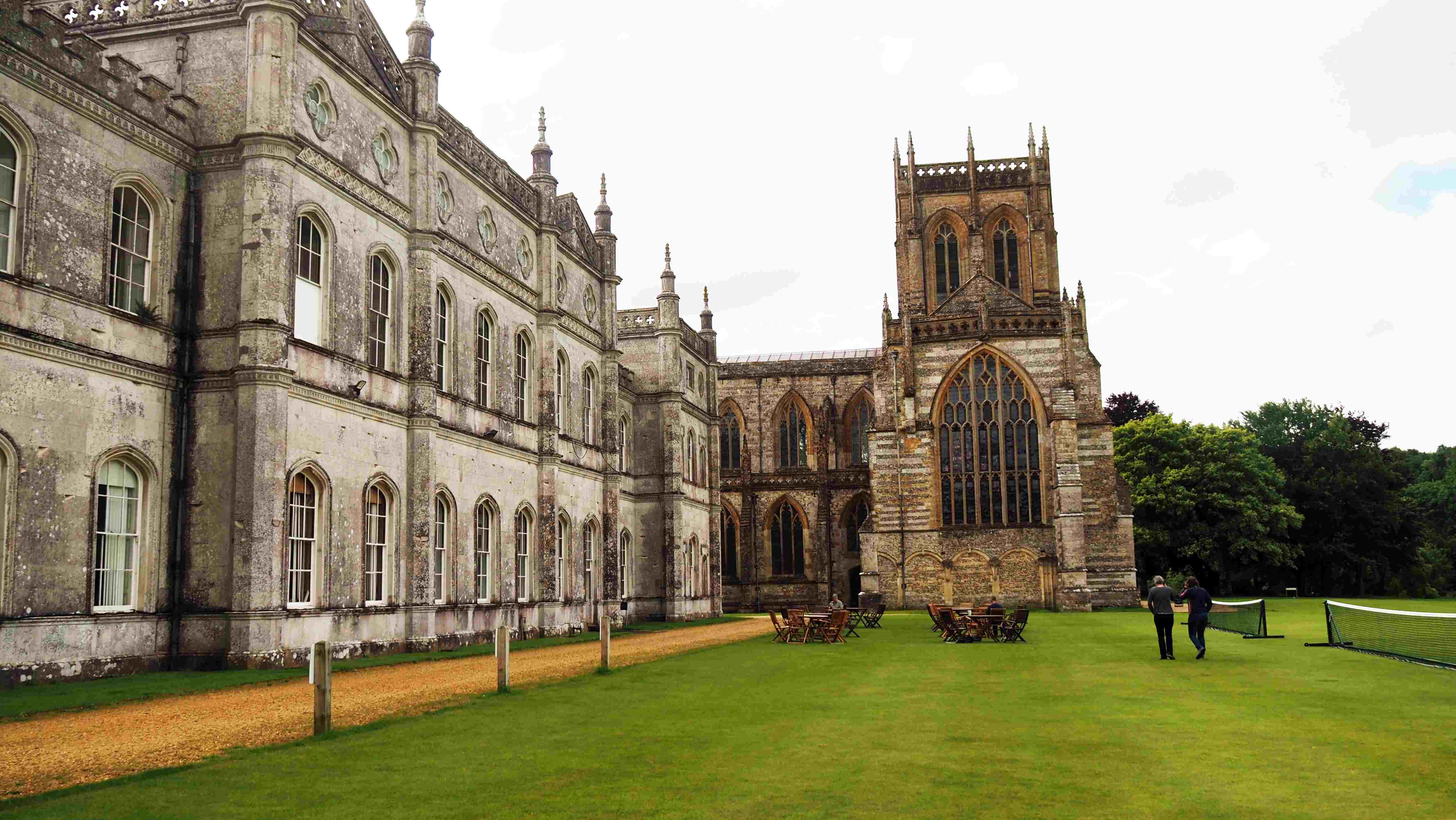 4 Stunden dauerte die Überfahrt, während es immer mehr dämmerte und ich dann im Dunkeln 21.45 Uhr in Poole ankam. Meine AirBnb Gastgeberin in Hafennähe erwartete mich schon und führte mich in mein kleines Zimmer. Entgegen meiner Annahme gab es kein Frühstück (Ich meinte, ich hätte das in ihrem AirBnB-Profil gelesen), aber sie spendierte mir freundlicherweise etwas Brot. Dann ging es endlich per Rad los, denn ich musste zwischen 11 und 12 Uhr in der Milton Abbey sein. Ich hatte mir eine Streckenvariante für mein Garmin Navi gebastelt, die mit an bequemsten schien, mit der ich nach 32,4 km dort ankommen würde. Hauptsächlich über Nebenstraßen, wobei sich ein Stückchen stark befahrene A31 nicht vermeiden ließ. Rechtzeitig traf ich in der Abbey als einziger Radfahrer ein.
