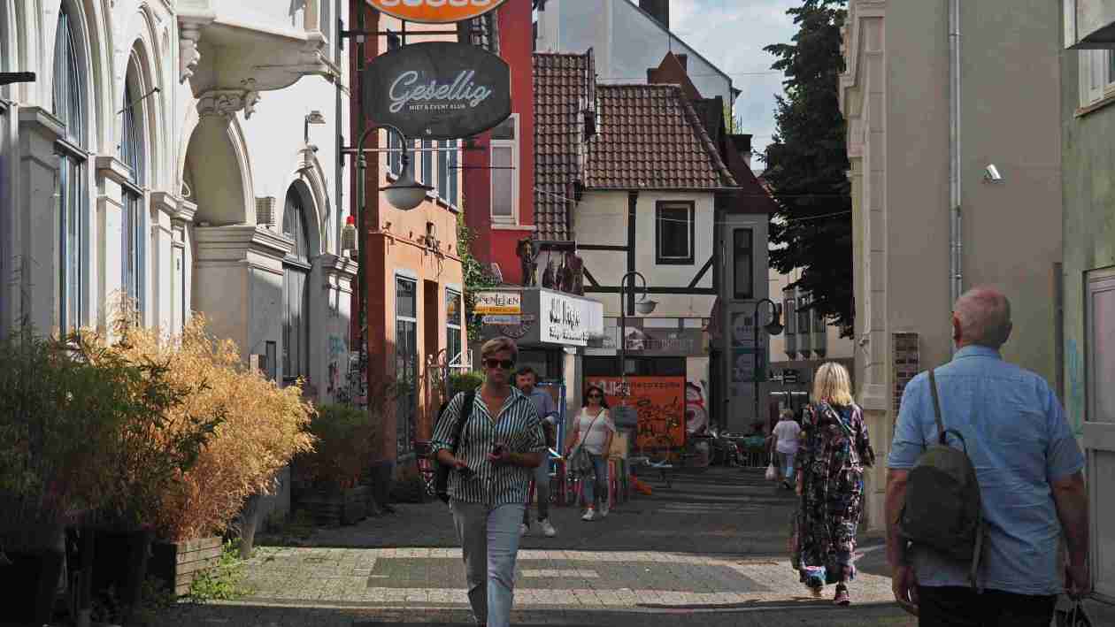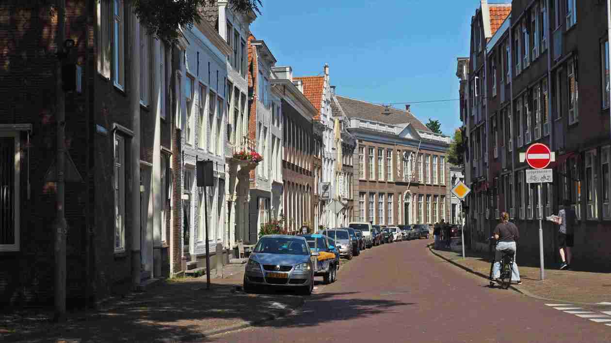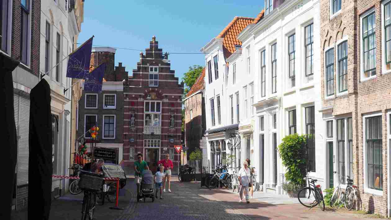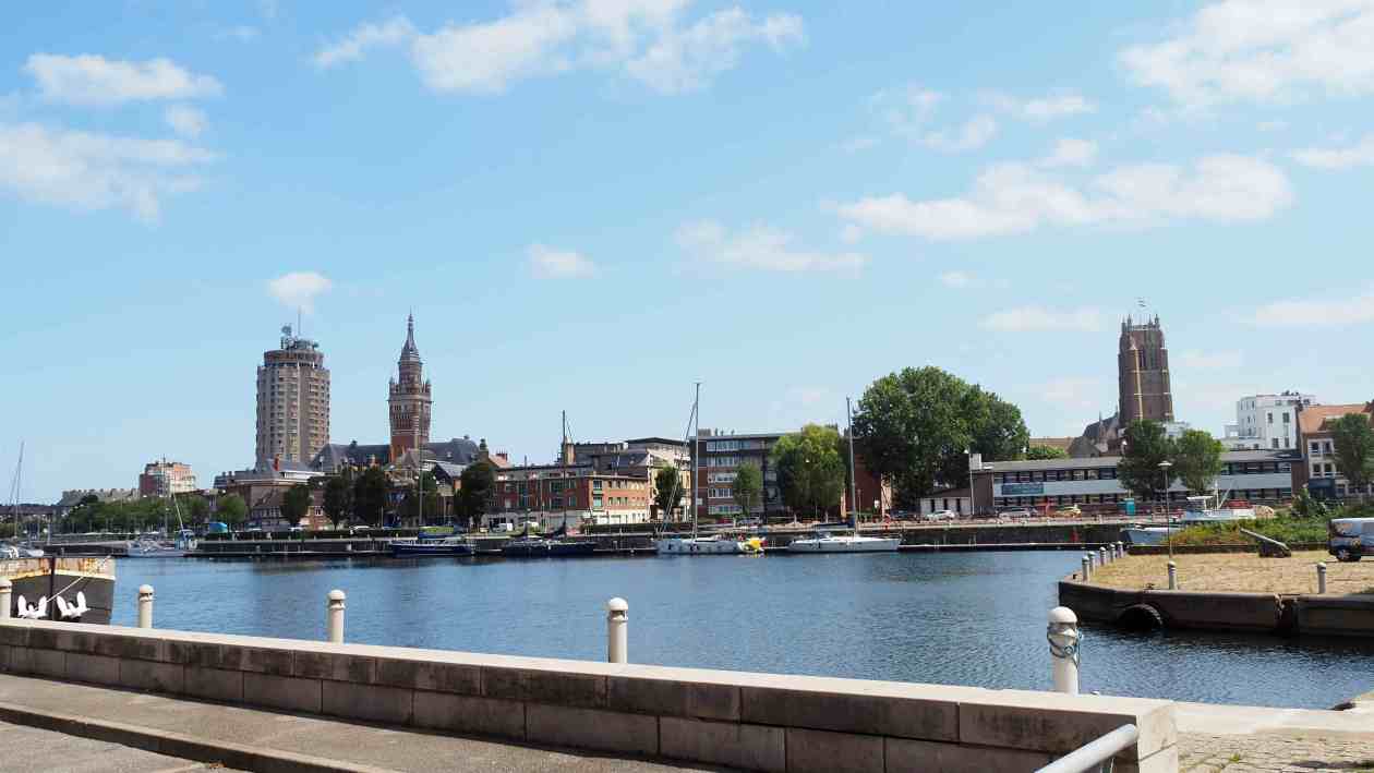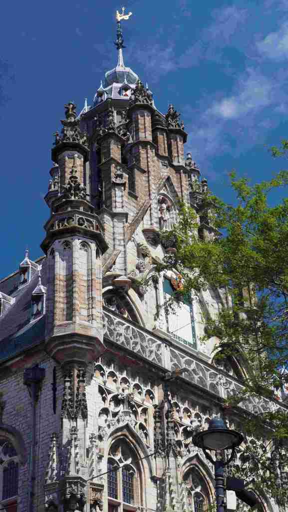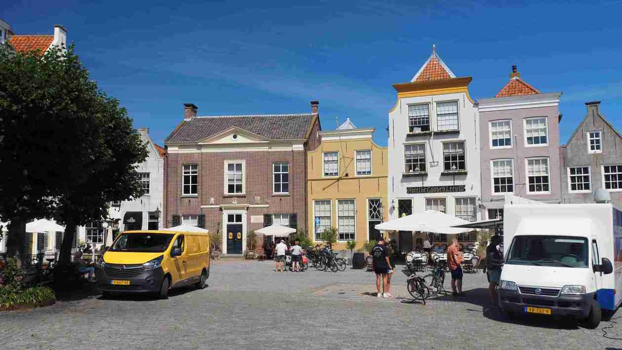 Diese sollte halbstündlich fahren. Als ich an der Anlegestelle ankam, hatte ich das zweifelhafte Vergnügen, mich in einer langen, gewundenen Schlange anzustellen, die sich gefühlt endlos langsam vorwärtsbewegte. Eine Fähre reichte für diese Menschenmenge nicht, – also eine weitere halbe Stunde auf die nächste warten, die sich dann auch erst einmal entleeren musste, bevor es dann endlich langsam weiter ging, vorbei am Fahrkartenautomaten, dann wieder warten, dann endlich nach mindestens einer Stunde Dauer dieser Prozedur legte die Fähre endlich ab nach Vissingen. Von hier aus fuhr ich dann am Kanal weiter nach Middelburg, der Hauptstadt von Zeeland. Hier wollte ich zum Rathaus, das Stadhuis, um eines der bedeutendsten gotischen Gebäude der Niederlande betrachten zu können – aber oh je, der Platz darum herum war vollgestellt mit Buden und Karussells. Ich fand für gute Fotos keinen sinnvollen Abstand. So blieb es mir leider im Jahrmarkstgetöse verborgen und ich begnügte mich mit einem Streifzug durch innerstädtische Gassen dieser malerischen Stadt.