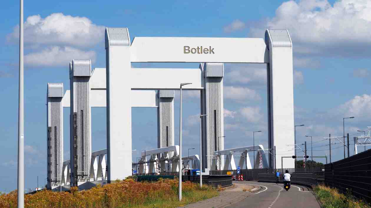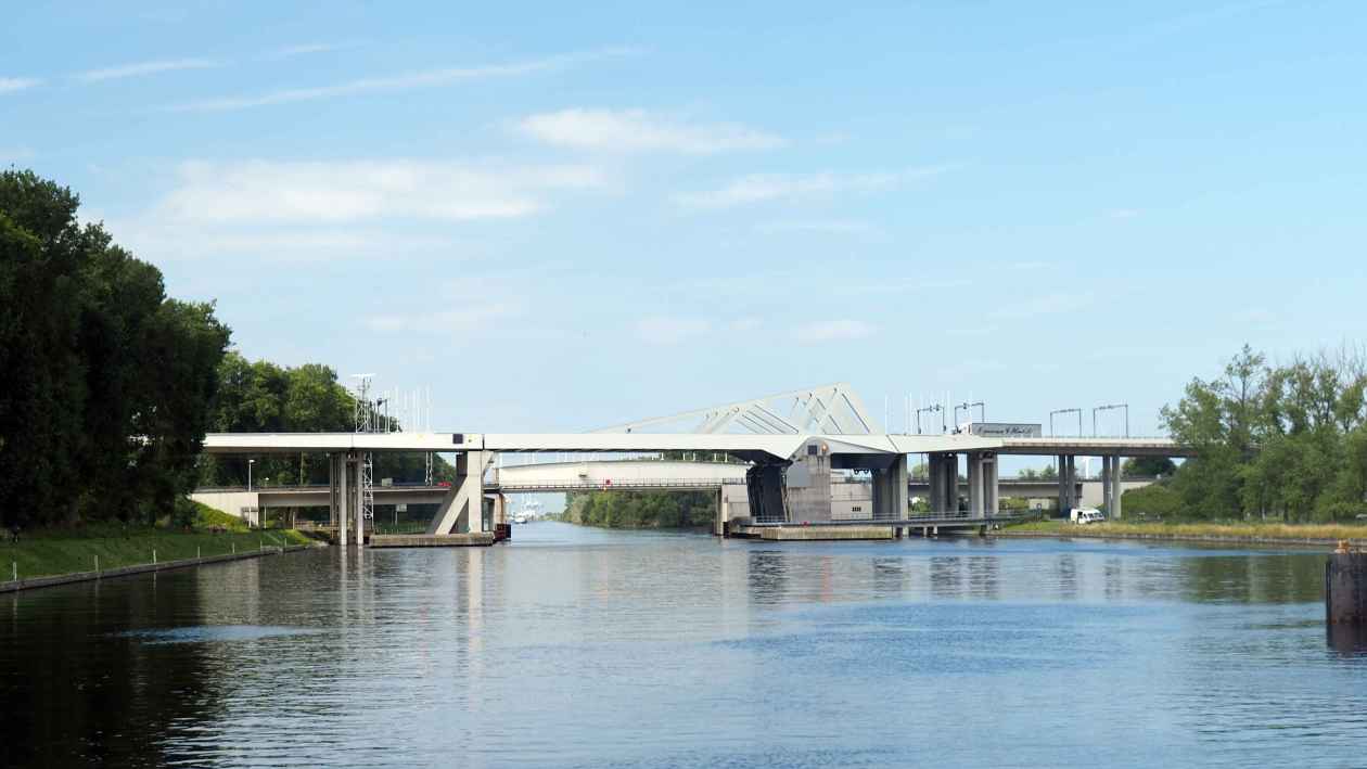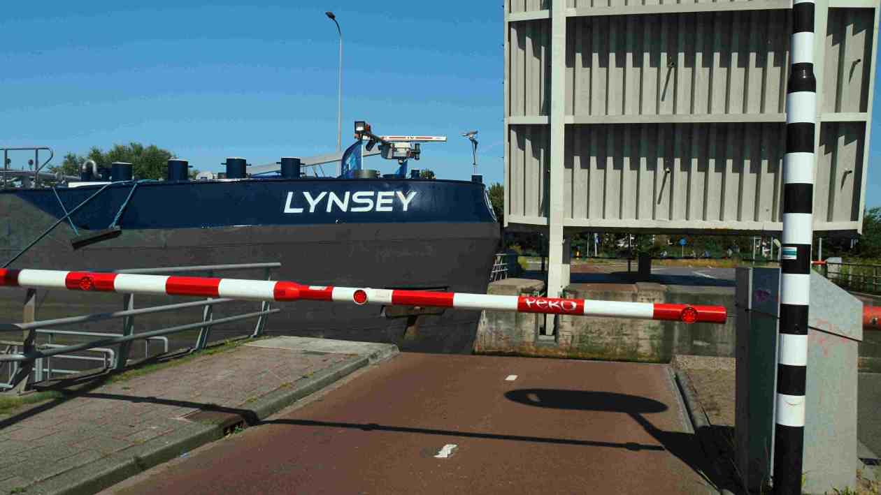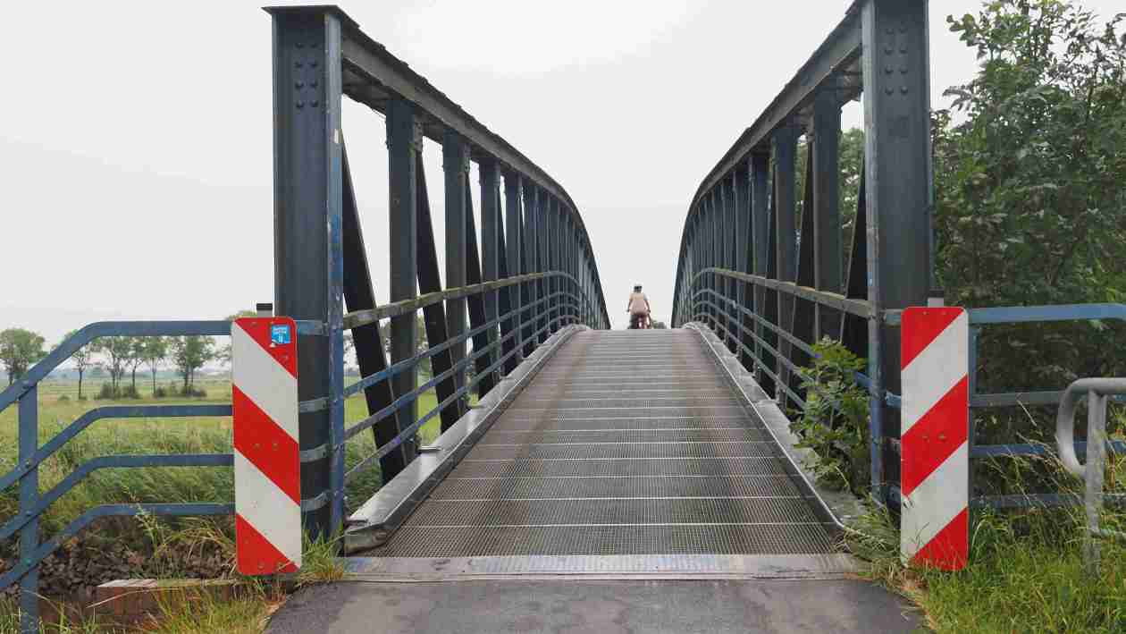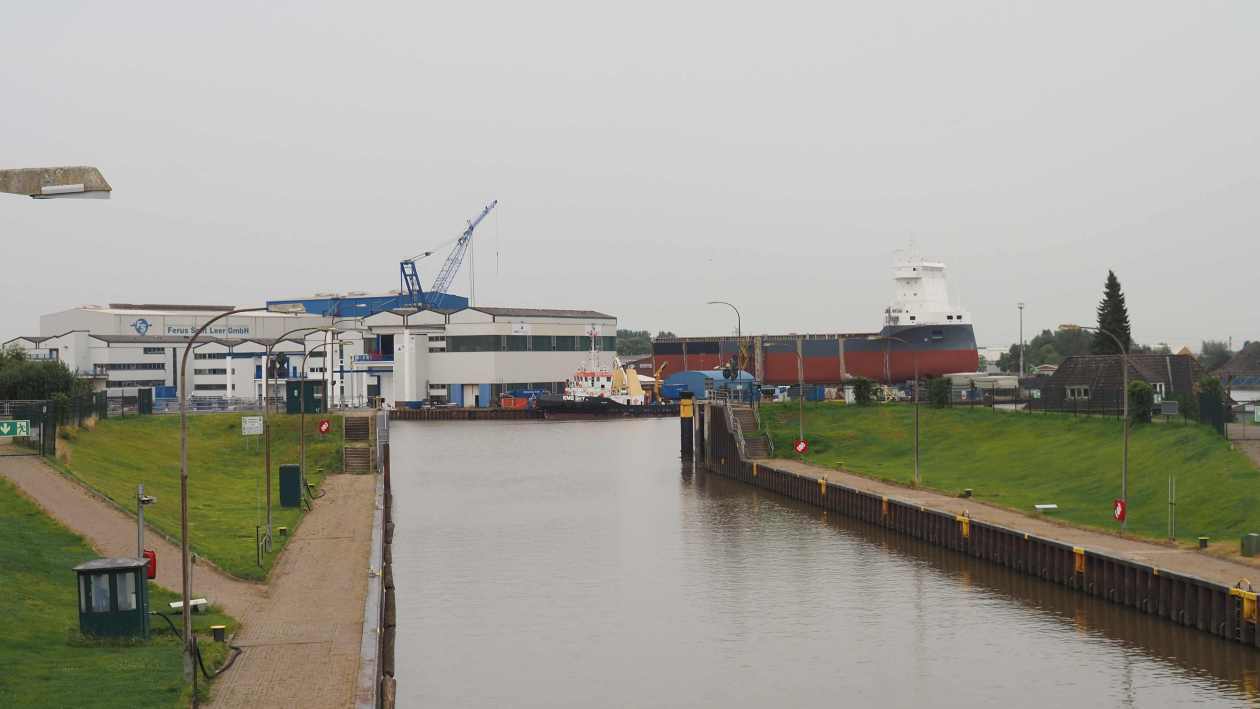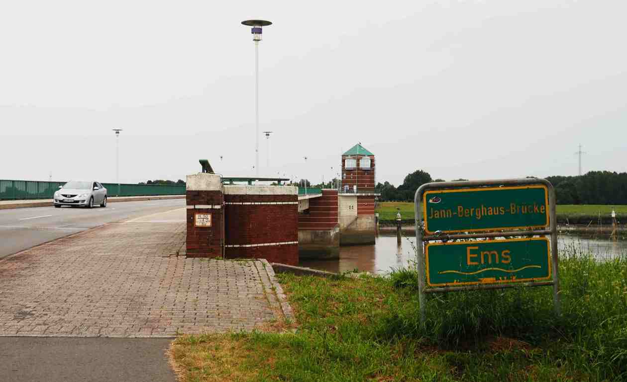 Und dann, hinter Weener, wies mich mein Routing zu einer gemischten Bahn/Radbrücke über die Ems. Aber da war keine Brücke … mehr. Die Friesenbrücke in Weener (Niedersachsen) wurde im Dezember 2015 durch einen Schiffsaufprall zerstört! Und tatsächlich sah man einen Kran, da wo mal eine Brücke war. (Inzwischen, 2025, wurde sie wieder für 200 Millionen € ersetzt, womit auch die direkte Bahnverbindung zwischen Bremen und Groningen wieder hergestellt werden kann.)