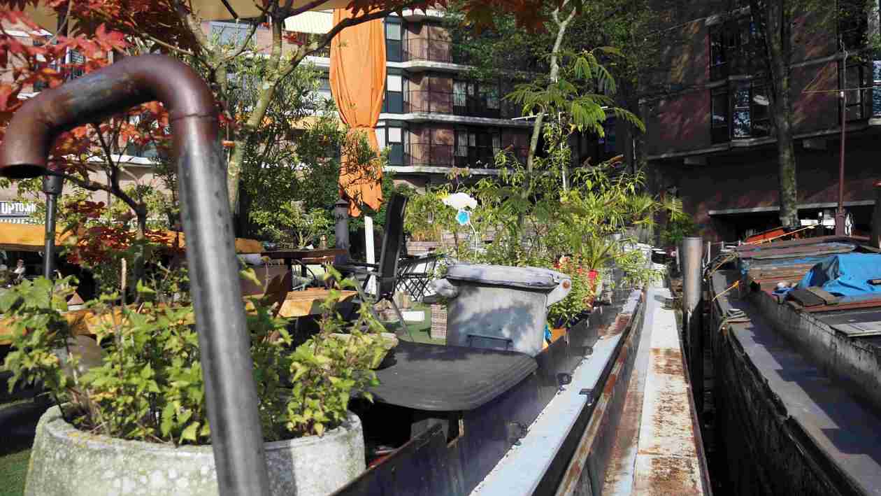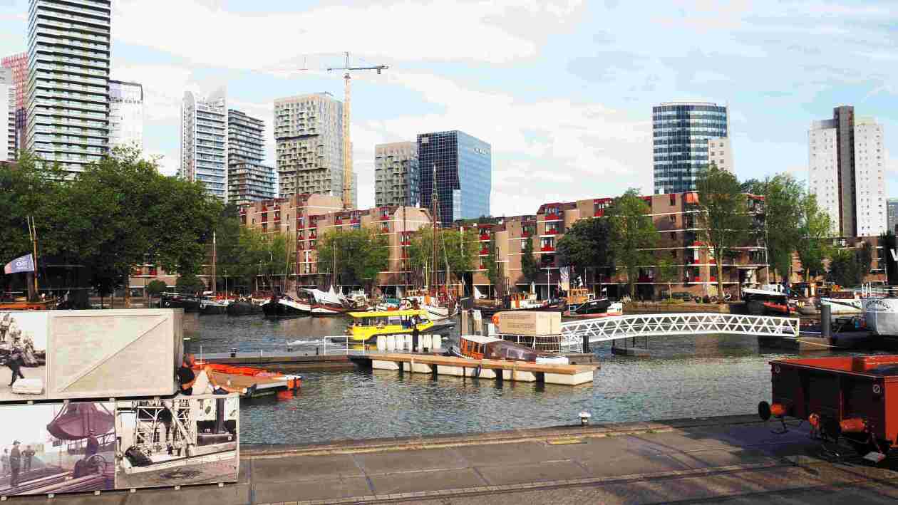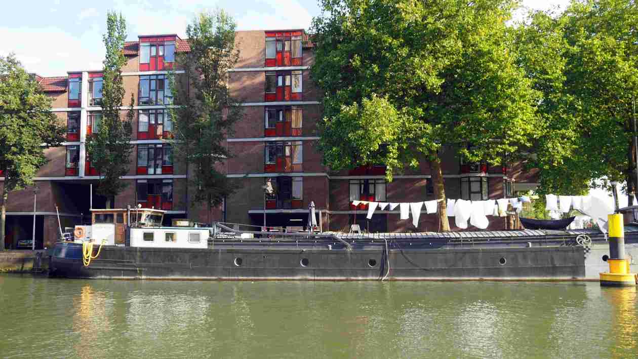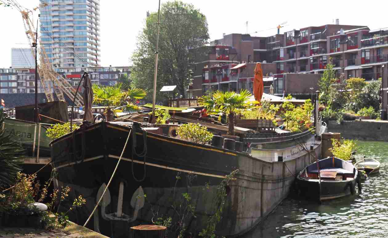 Und so landete ich, nach einem ersten Eindruck von Rotterdams moderner Architektur, am Scheepmakershaven an einem als Quartier vermieteten, mit Pflanzen bewachsenen Lastkahn und machte mich bemerkbar.