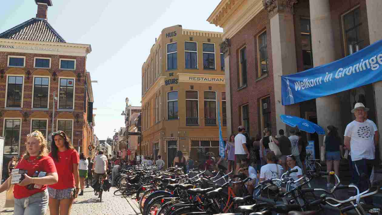 Mit ungutem Gefühl startete ich am anderen Morgen bei bereits frischem Ostwind und entschied, auf der anderen Seite des Van Starckenborg Kanaal zu fahren, in der Hoffnung auf etwas mehr Windschatten. Das schien auch erst einmal zu klappen. Erst einmal, aber dann gab es keine Bäume mehr, keine Büsche als Schutz, nichts. Zum Glück kam dann bald Groningen, eine Universitätsstadt, in der offenbar gerade ein studentisches Festival stattfand, was das Durchkommen erheblich erschwerte.