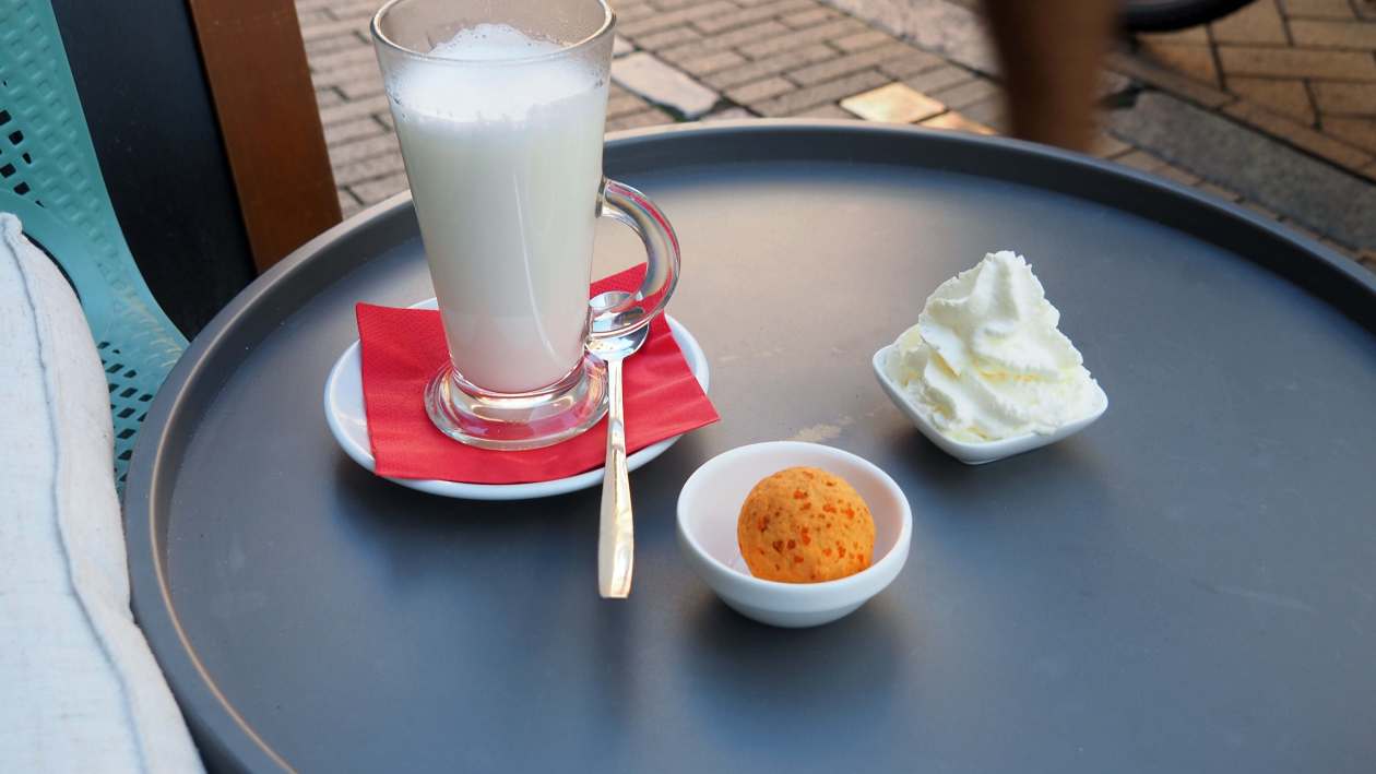 Plötzlich sah ich eine interessante Eisbar. Es gab dort Eis-Kugeln verschiedenen Inhalts, serviert in heißer Milch, mit Sahne! Ich konnte nicht widerstehen und bestellte mir eine heiße Milche mit Orangeneis und genoss es während sich die Kugel langsam auflöste. Dann schob ich weiter, aber ich war natürlich noch nicht satt, wollte mich aber nicht noch irgendwo länger aufhalten, also sollte es eine Portion Pommes Frites sein – die dann doch zu groß für mich war… Egal. Weiter, raus aus der schönen, alten, aber zu vollen Stadt.