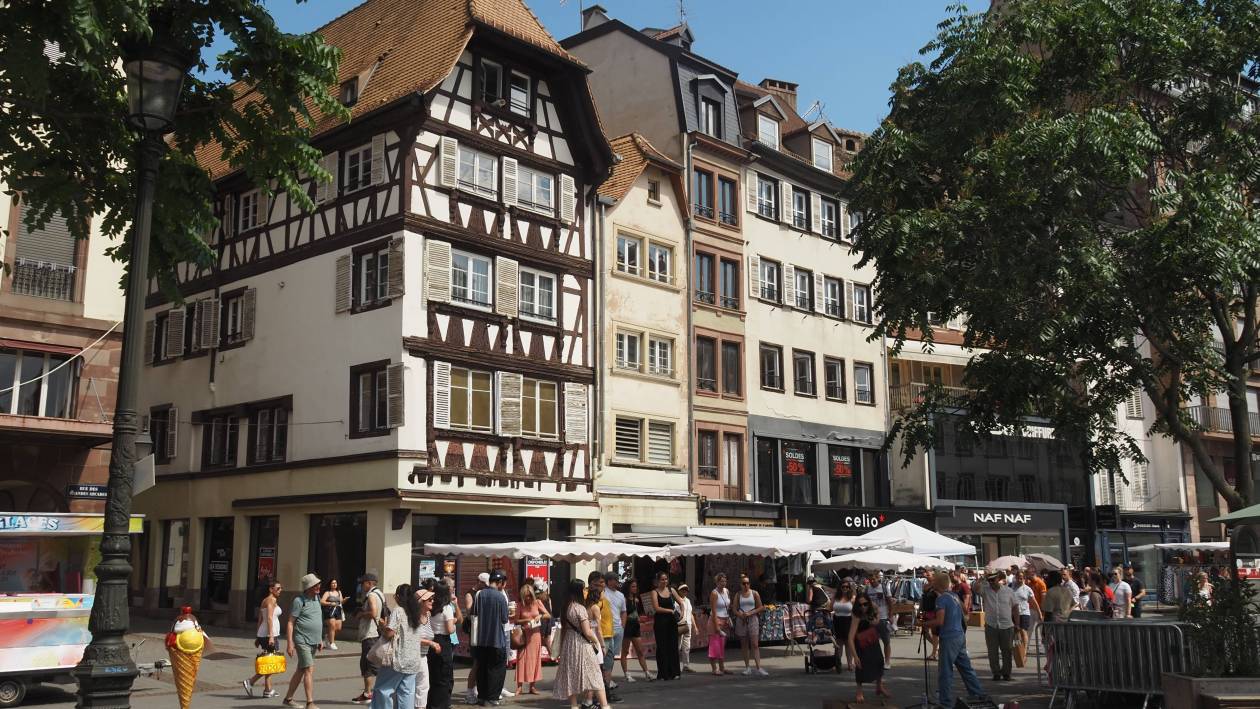 Nach einem Kaffee sowie Pflaumen-, oder Zwetschgenkuchen wie man hier sagt, legte ich mich in den Schatten eines Baumes in einer Grünanlage am Rhein und versuchte vergeblich etwas Nachtschlaf nachzuholen. Irgendwann gab ich den Versuch auf und fuhr über die elegante Radfahrer Rhein-Brücke, vorbei an stylisch umgebauten ehemaligen Speicher bis in die von Touristen völlig überfüllte Innenstadt, aß dort ein Eis, trank einen „Café aux lait“ und wartete die restliche Zeit im Bahnhof auf die Einfahrt des TGV. Den Bahnsteig darf man in Frankreich ja erst betreten, wenn der Zug da ist.
