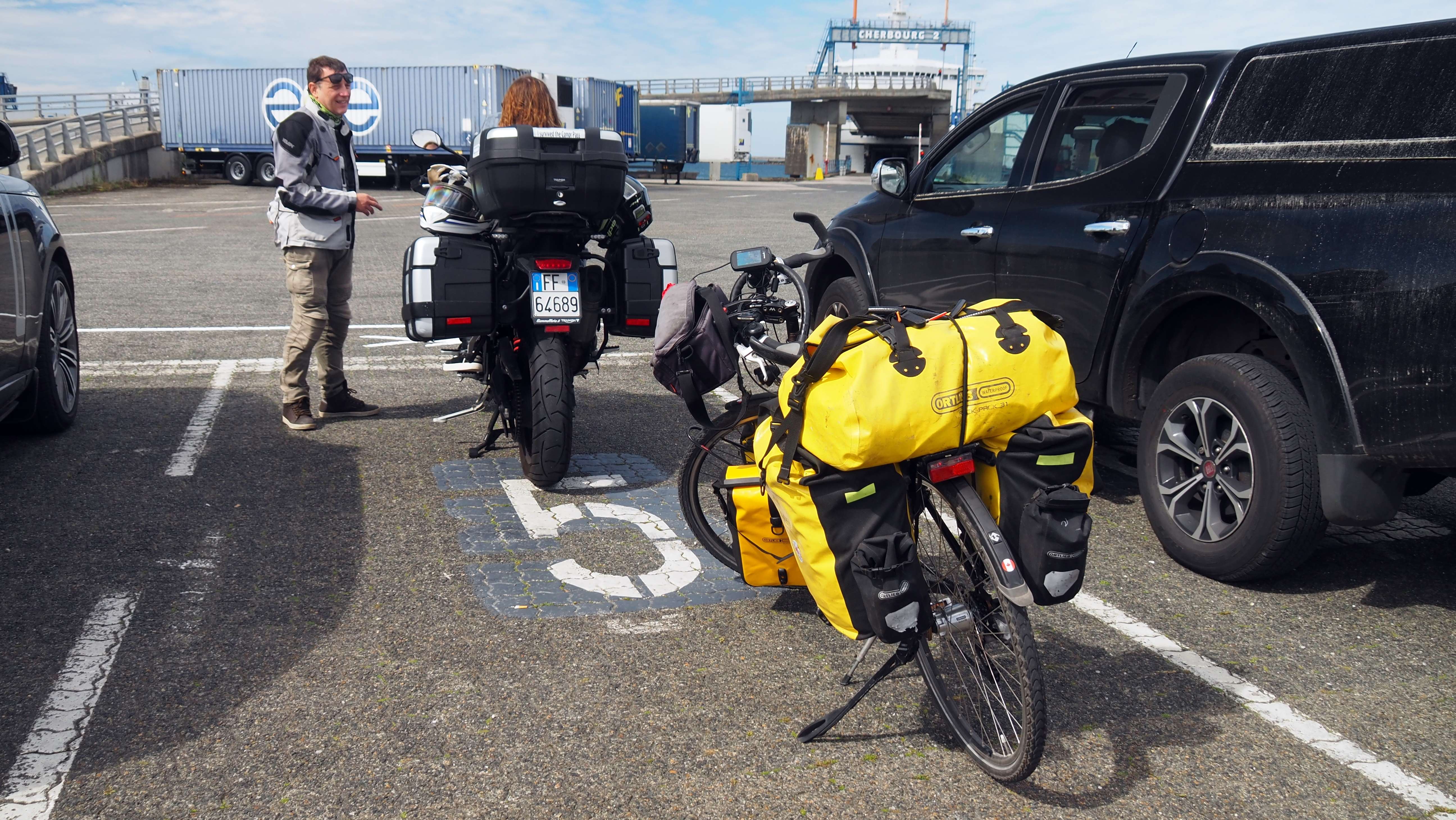 Später verfuhr ich mich erst einmal, weil ich an einem Kreisverkehr die richtige Abfahrt hinunter nach Dover übersah. Dann erkundete ich das Städtchen, das ebenfalls eine überraschend repräsentative Strandpromenade hat. Es war noch viel Zeit und so aß ich endlich eine Portion Fish’n Chips, was ich die ganze Zeit vermisst hatte. Das Hafengelände erwies sich als riesig und ich musste erst bis ganz zum Ende fahren und dann in einer Schleife zurück. Es war erst nach 14 Uhr. Ich ging in das Check-In-Büro und der Mann am Schalter meinte, ich könne ja die nächste Fähre eine Stunde früher nehmen – da wäre noch Platz. Prima, also nichts wie los. Zusammen mit 3 jungen englischen Radsportlern, die mal eben ein bisschen durch Frankreich radeln wollten, verzurrten wir die Räder im Laderaum.